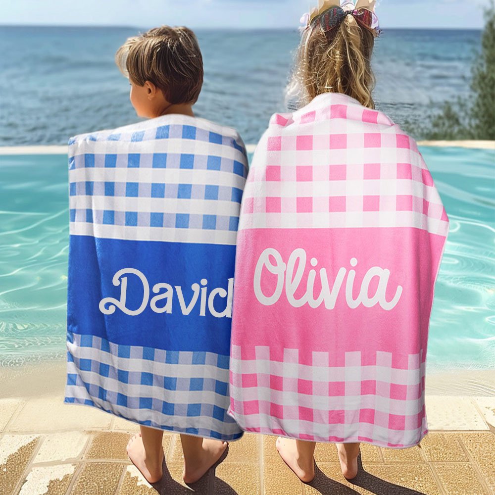 Esta toalla de playa presenta un patrón de cuadros vichy, añadiendo un toque infantil y atrayendo la atención de los niños, lo que permite encontrar al bebé de un vistazo en la playa. La toalla está disponible en 6 colores. Personaliza el nombre del niño para hacer que cada regalo esté lleno de cariño.