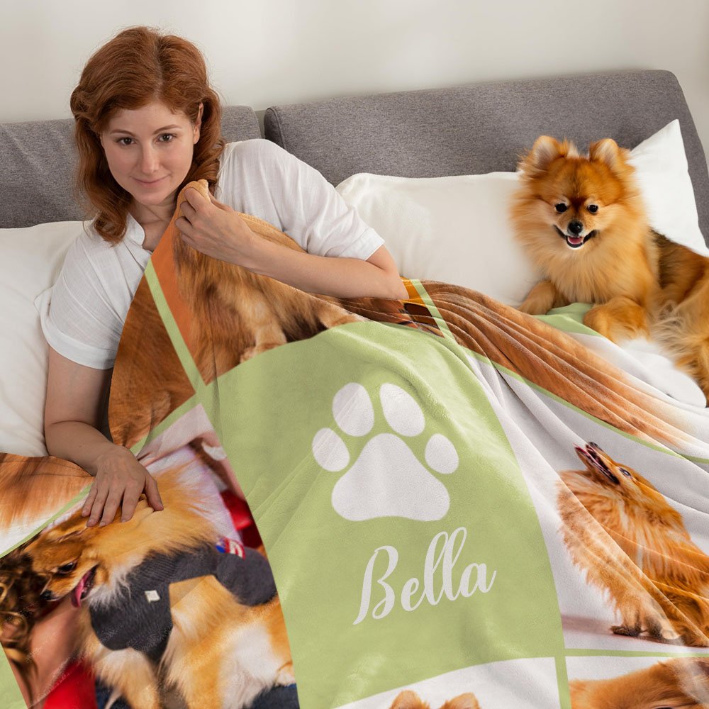 Esta manta personalizada con fotos de mascotas está diseñada para amantes de los animales. Puedes personalizarla con 8 fotos y el nombre de tu mascota. Además, hay 30 colores de fondo para elegir, permitiendo que la compañía de tu mascota siempre llene tu corazón de calidez.