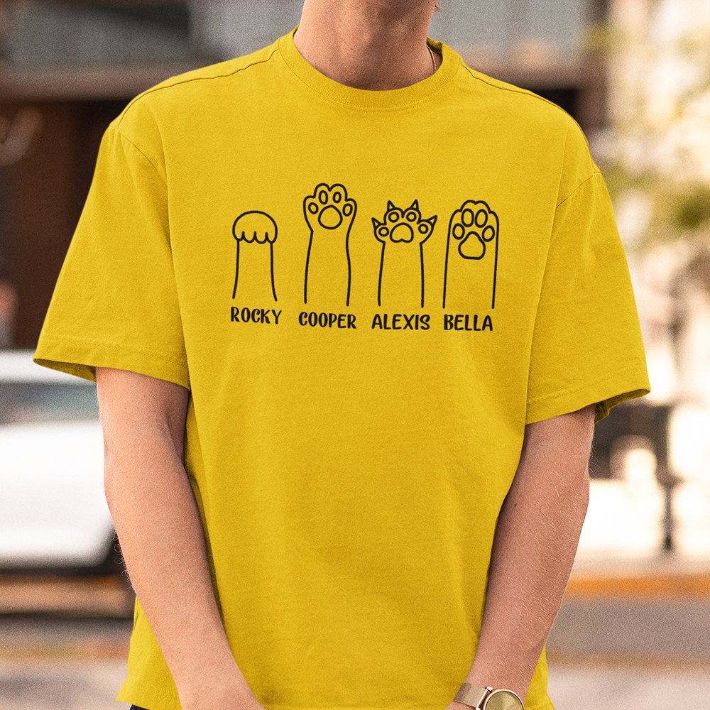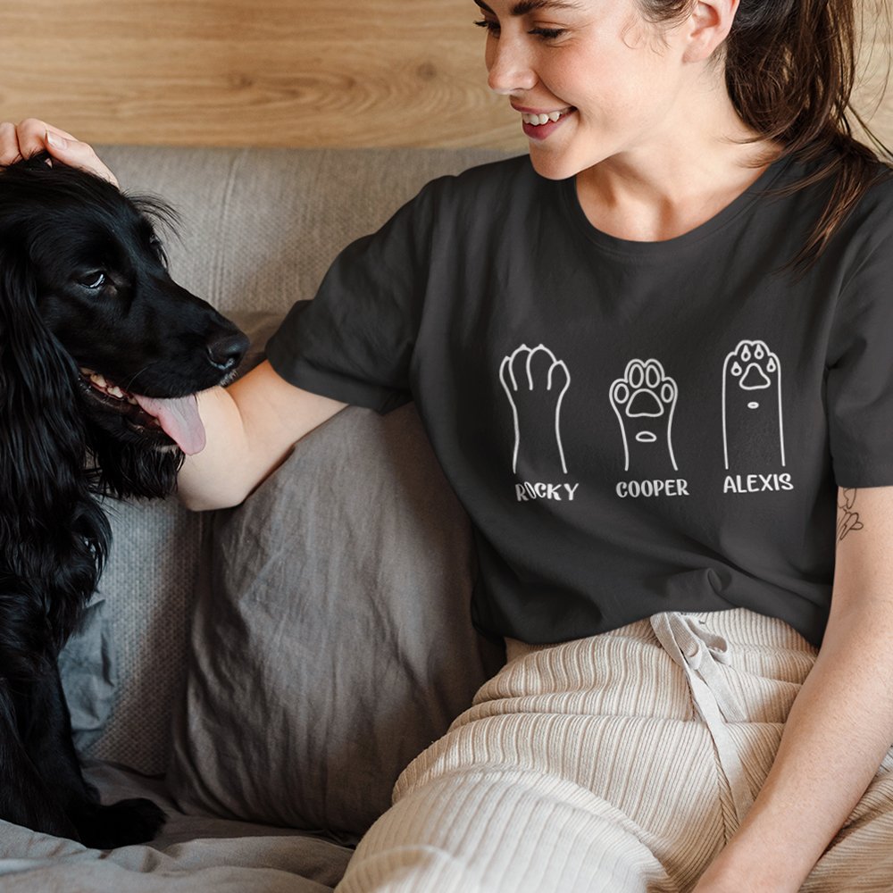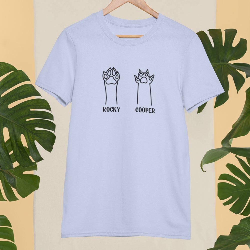 Esta camiseta presenta un estampado sin costuras de simpáticas huellas de gato o perro, mezclando el amor por ambos tipos de queridas mascotas. Los clientes pueden elegir entre 1 y 4 estampados de patas y personalizar el nombre de la mascota, creando una prenda realmente única y personalizada que celebra el vínculo especial entre los dueños de mascotas y sus peludos compañeros.