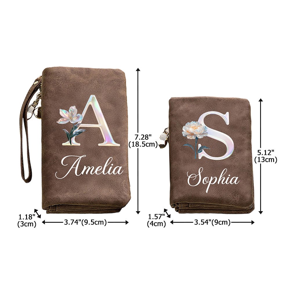 Elige entre un diseño corto o largo, selecciona entre 7 colores, escoge la flor de nacimiento correspondiente a su mes de nacimiento y agrega un nombre. El diseño impreso presenta una inicial iridiscente junto con la flor de nacimiento, transformando una cartera básica en una pieza sentimental que celebra su identidad.