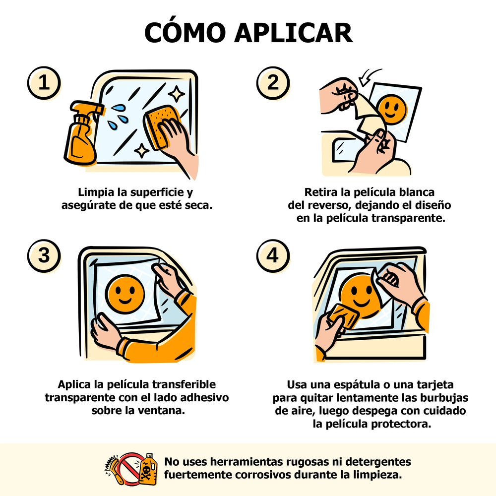 1. Limpia la superficie y mantenla seca. Evita usar herramientas ásperas o limpiadores corrosivos fuertes al limpiar. 2. Despega el papel de soporte blanco, dejando el diseño en la lámina transparente. 3. Aplica la película transparente de transferencia con la cara adhesiva sobre la ventana. 4. Utiliza un rascador o una tarjeta para eliminar lentamente las burbujas de aire antes de despegar lentamente la película protectora.