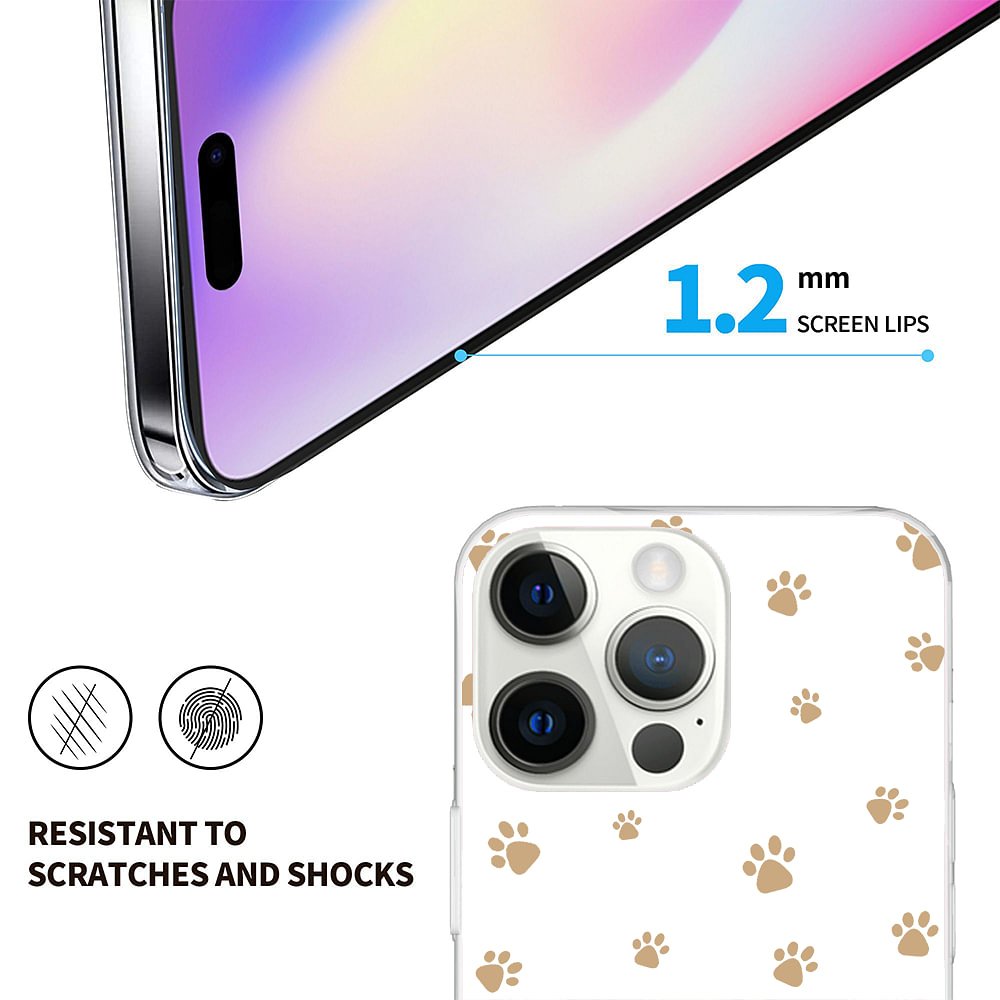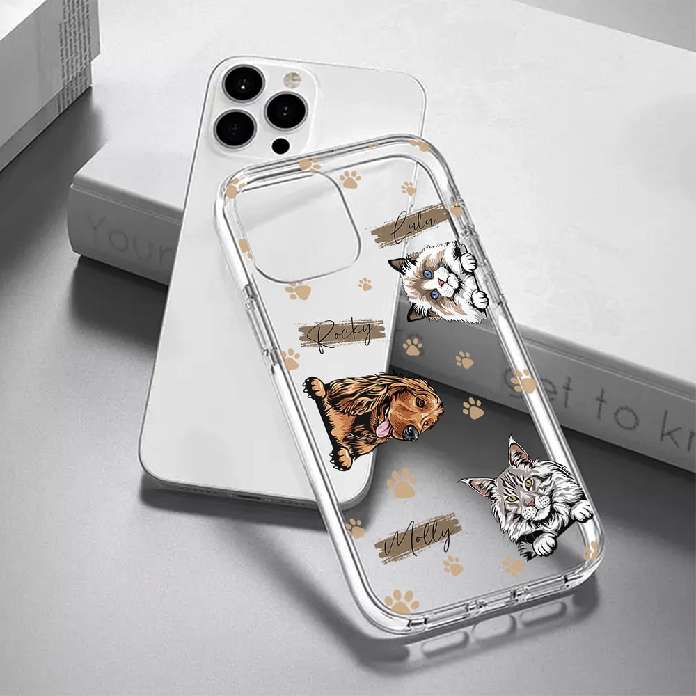 Nuestras fundas para móvil presentan un tema de mascotas con un fondo transparente adornado con muchas huellas de patas, y puede elegir el número de mascotas así como sus razas y añadir sus nombres para convertirlo en un regalo único y atento.