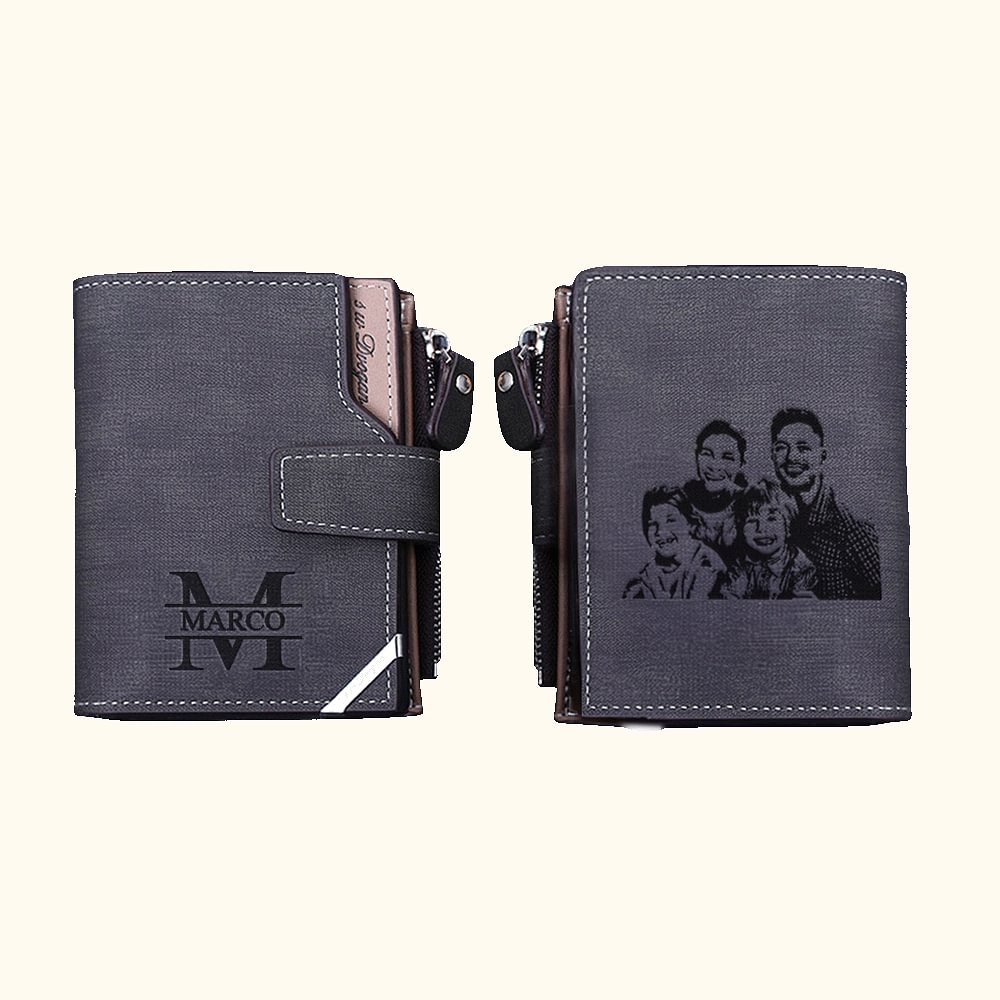 Esta cartera para hombre está disponible en 3 colores diferentes. El diseño de la cartera es simple y elegante, con la posibilidad de personalizarla en la parte delantera con un nombre y en la parte trasera con una foto, según tus preferencias. Esto la hace aún más especial.