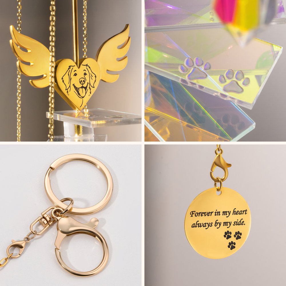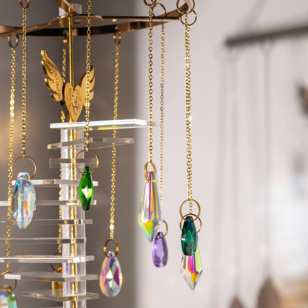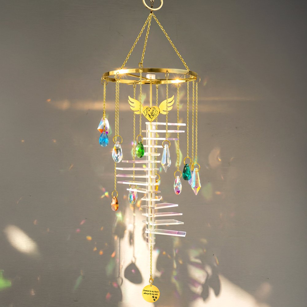 Este carillón de viento en memoria de su mascota combina a la perfección el simbolismo del Puente del Arco Iris con el diseño de una escalera ascendente, que representa el ciclo de la vida y los interminables recuerdos de la compañía de su mascota. La superficie reflectante crea manchas vibrantes y coloridas, por lo que no sólo tiene un significado emocional, sino que también es una impresionante pieza de decoración para el hogar. Personalizado con el retrato de su mascota y una inscripción conmemorativa personalizada, se convierte en un regalo único y precioso en memoria de su mascota.