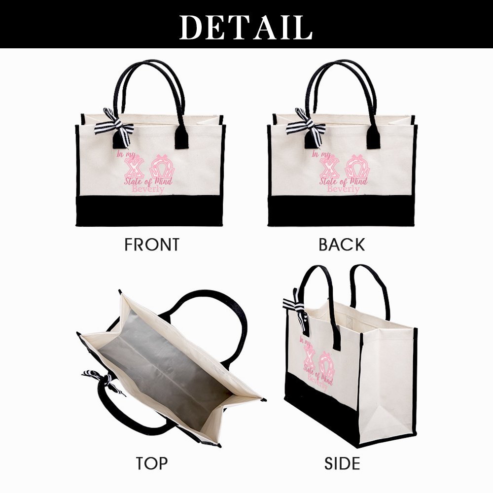 Este bolso tote utiliza elementos de diseño modernos y simbólicos, como las letras griegas rosas personalizables con lazos, que no sólo son exquisitas, sino que también están llenas de tradición sororal. El texto fijo "State of mind" expresa solidaridad y amistad hacia la hermandad. También puede personalizar su nombre en la bolsa para hacerla más específica.