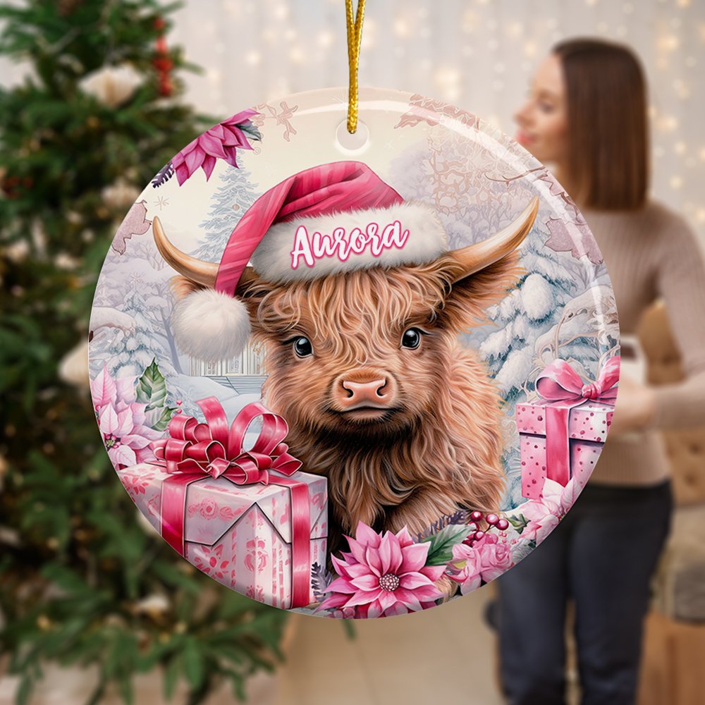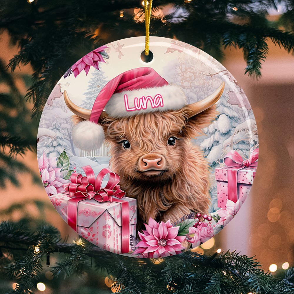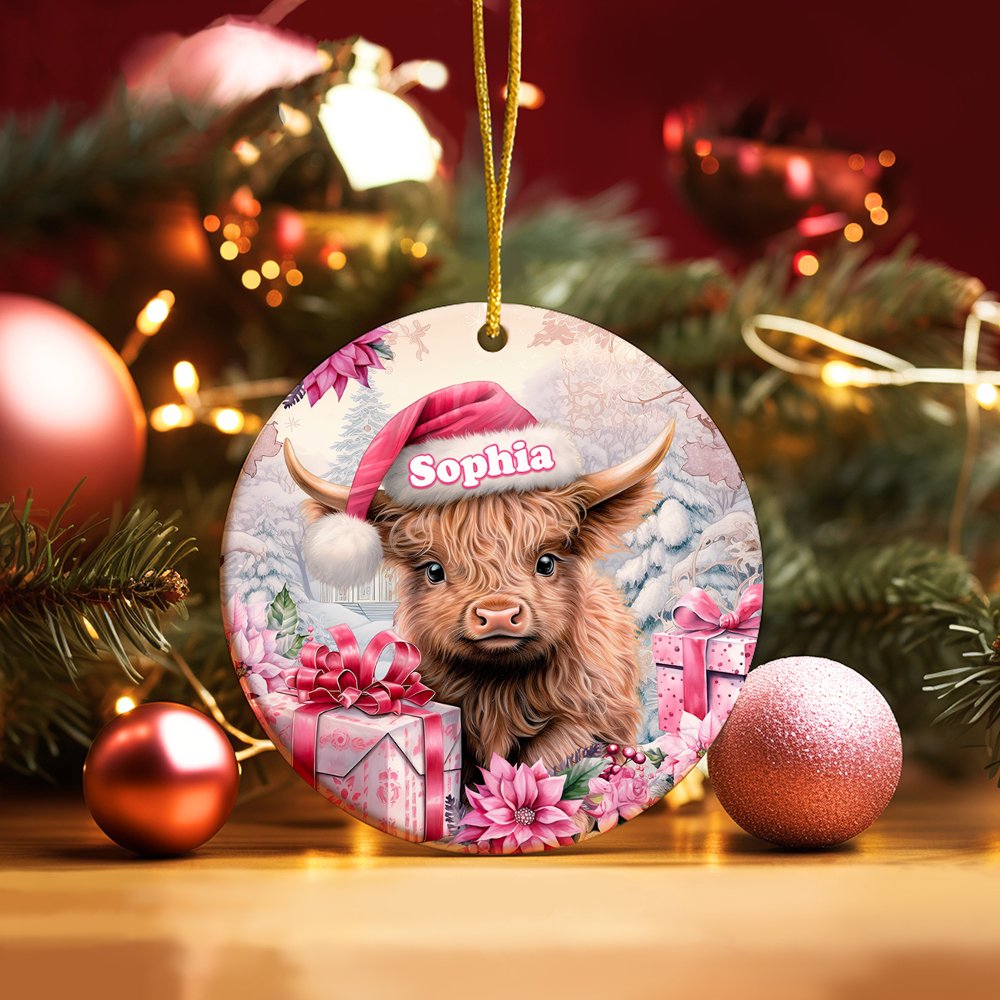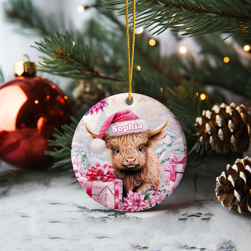 Vaca Highland rosa floral personalizada Adorno de cerámica con nombre para colgar Regalo de Navidad para la familia Amante de las vacas Highland