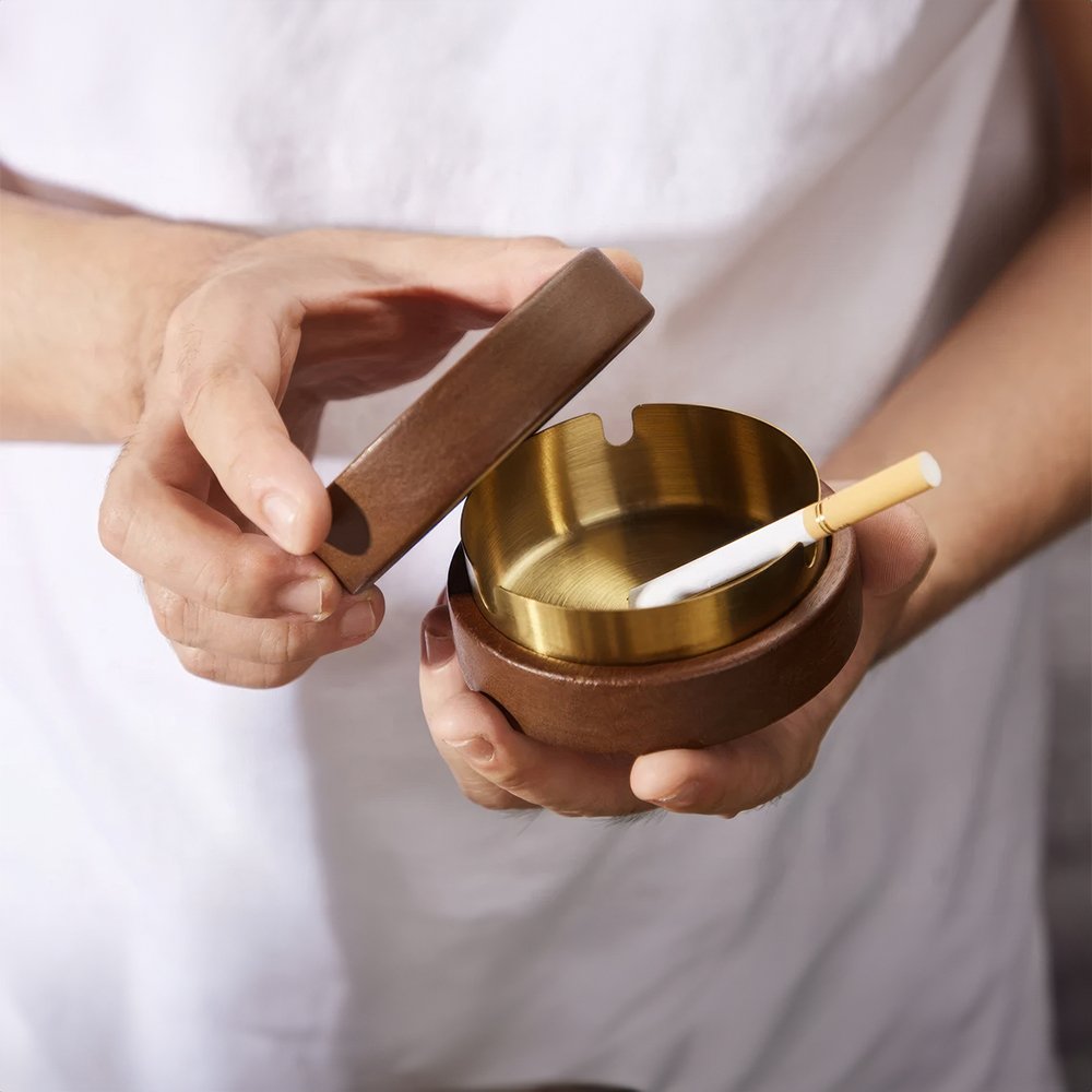 El cenicero presenta un diseño sencillo pero elegante, con un fuerte encanto masculino. Es especialmente atractivo para los usuarios que valoran la personalización y el gusto refinado. La combinación de madera de nogal de alta calidad y un interior de acero inoxidable es a la vez elegante y práctica.