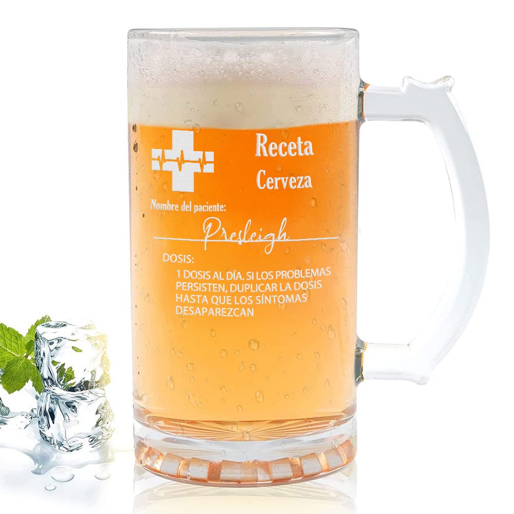 Este vaso de cerveza se destaca por su innovador diseño, inspirado en una receta médica. En el centro, se incorpora un electrocardiograma que rodea el clásico logotipo de la cruz médica, acompañado del mensaje: “Dosis: 1 dosis al día. Si los problemas persisten, duplicar la dosis hasta que los síntomas desaparezcan”. Este toque combina humor y sentido práctico, aportando un aspecto moderno y elegante al cristal transparente.