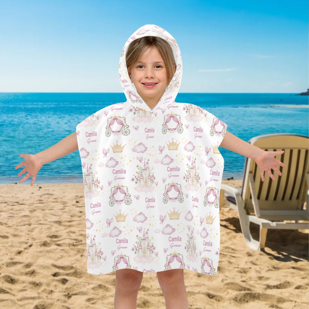 Esta toalla de playa con capucha presenta un suave tono rosa como color principal, adornado con elementos de temática de princesas, como castillos, carruajes, coronas y mariposas. El diseño de ensueño transporta a tu hija a un mundo de cuento de hadas, lleno de diversión y maravillas. Además, puedes personalizarla con el nombre y los apellidos de tu hija, para hacerla aún más única.