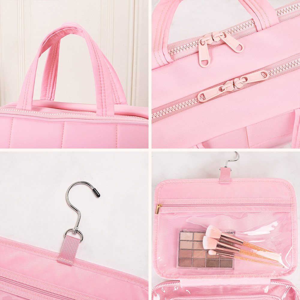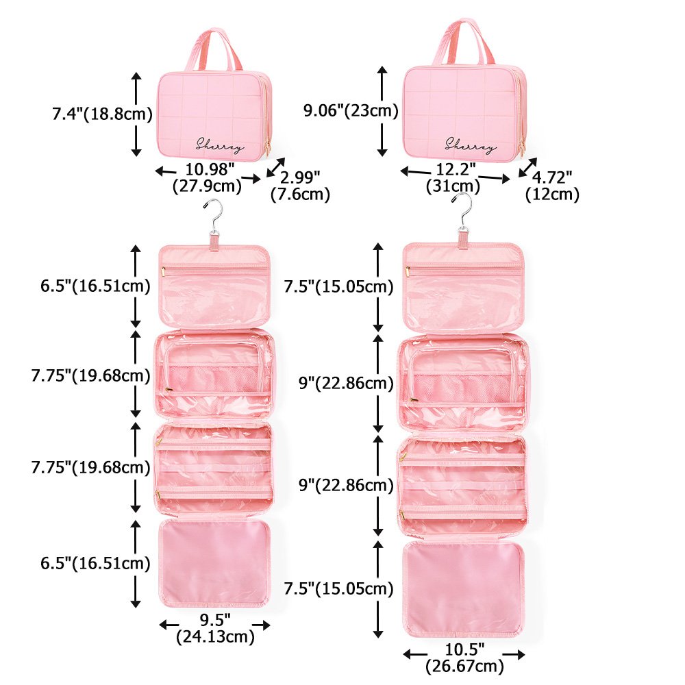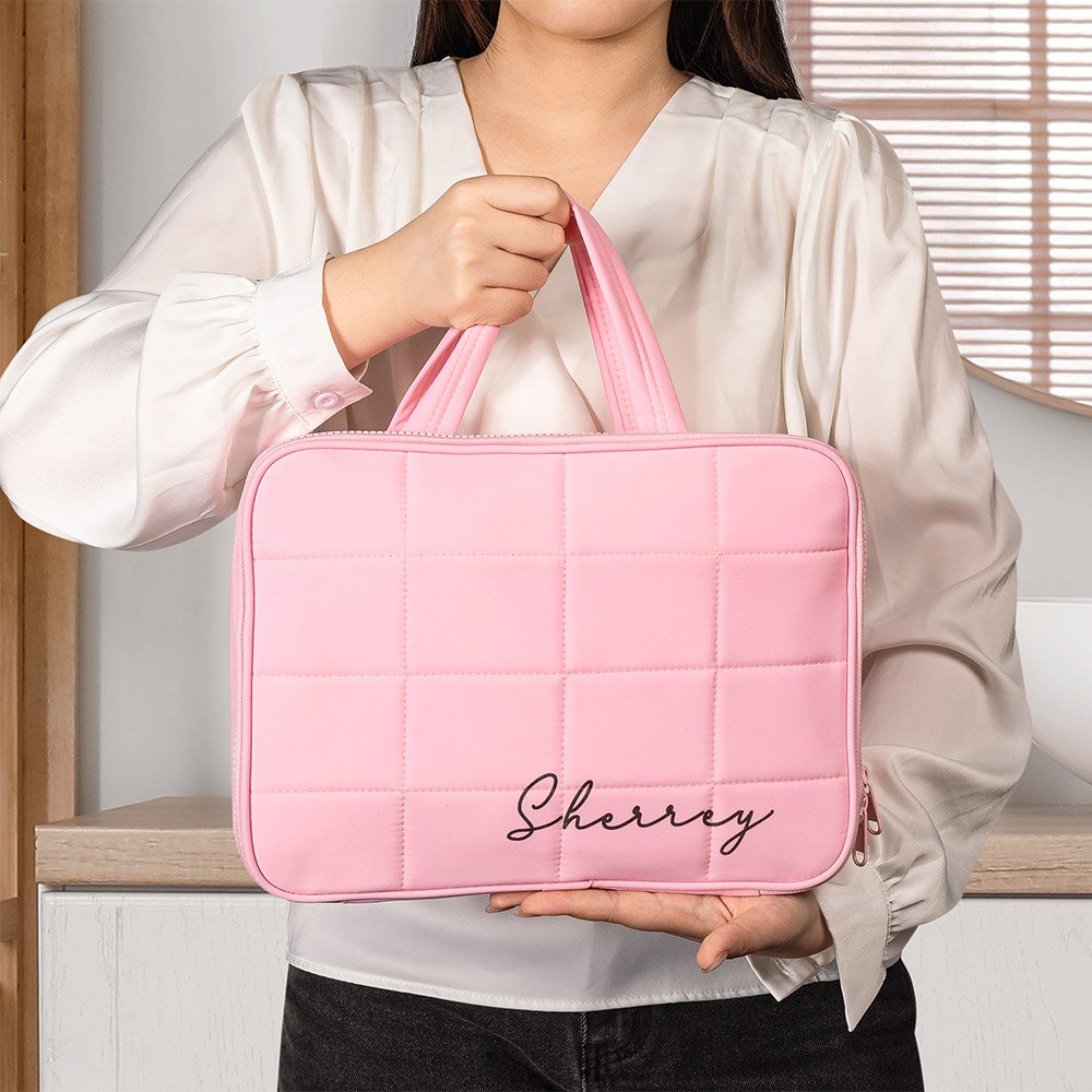 Esta bolsa de viaje para maquillaje presenta un diseño acolchado que añade un toque de moda a su aspecto general. Está disponible en tres colores y dos tamaños para adaptarse a sus preferencias y necesidades. Además, puede añadir su propio nombre a la bolsa, haciéndola más personalizada y atractiva.