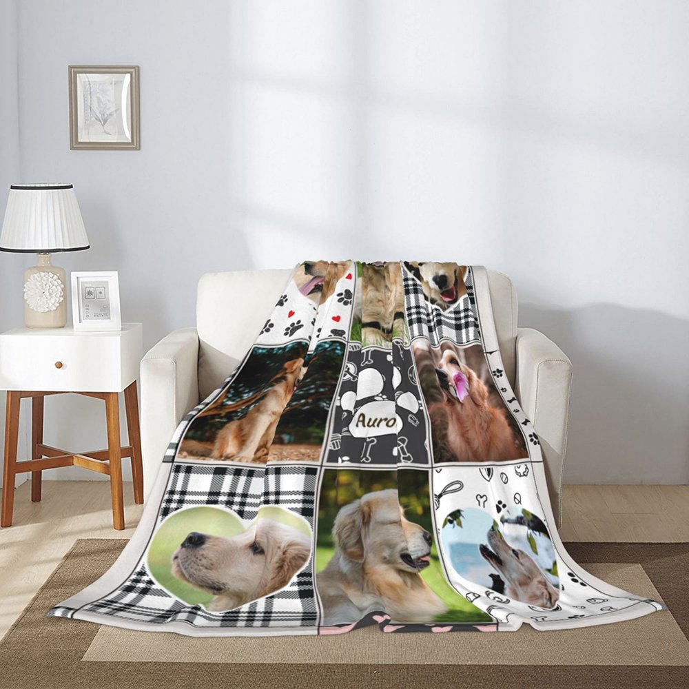 La manta con collage de fotos de cachorro te permite conservar los recuerdos de tu querida mascota mostrando sus adorables fotos y su nombre en una manta ultrasuave y ligera. Con la opción de dos materiales diferentes y varios tamaños, es perfecta para acurrucarte en casa o llevarla contigo en viajes de camping.