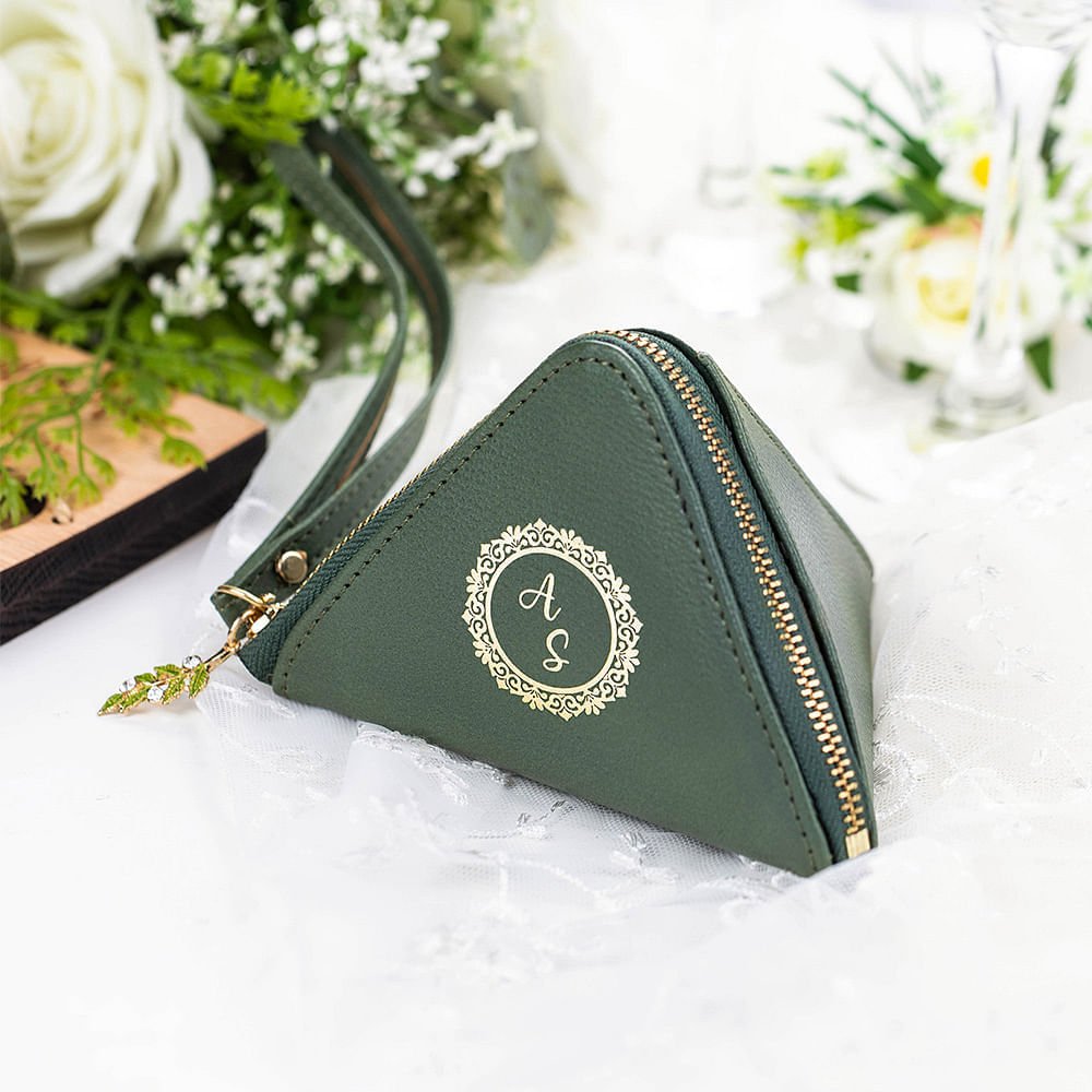 Este bolso piramidal para joyas tiene una estructura de cremallera. La cremallera utiliza el elemento de la hoja de parra más utilizado en la temporada de bodas para crear un producto con estilo americano y significado decorativo. La forma de este triángulo es similar a una pirámide, lo que también implica que el amor es más fuerte que el oro. La parte de personalización utiliza la forma de estampación en caliente de la bolsa y las iniciales de los apellidos de las dos personas como estilo de diseño, mientras que la guirnalda del anillo exterior se diseña utilizando los elementos nupciales más comunes.