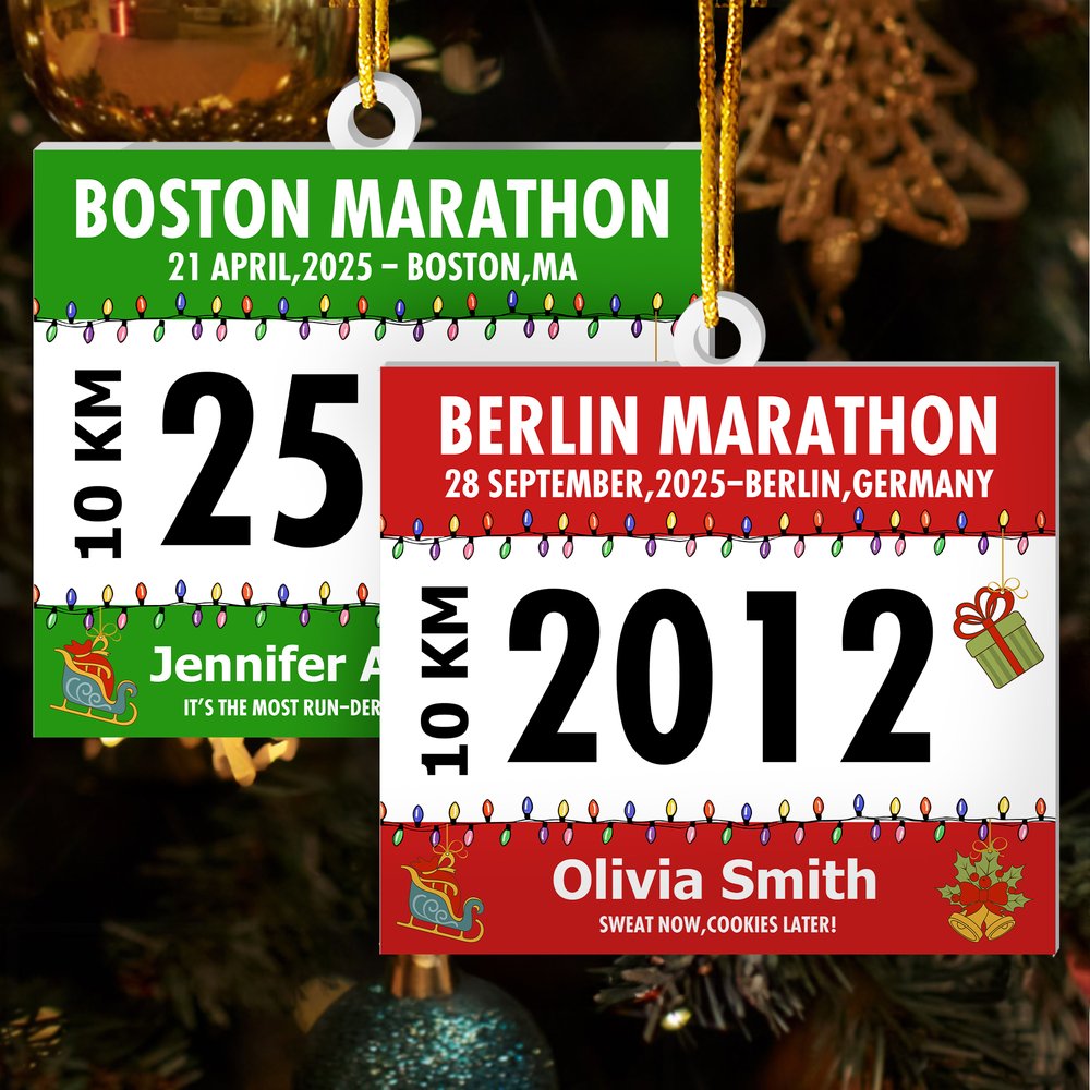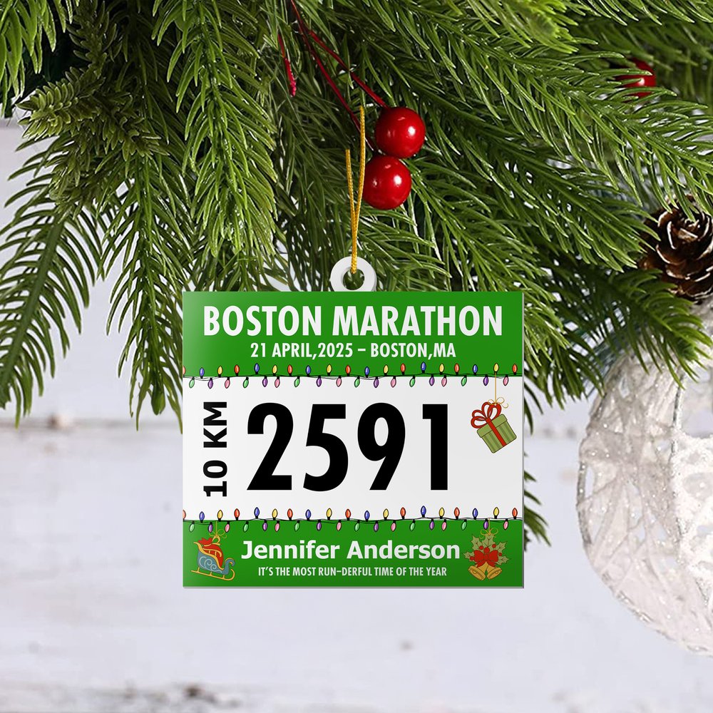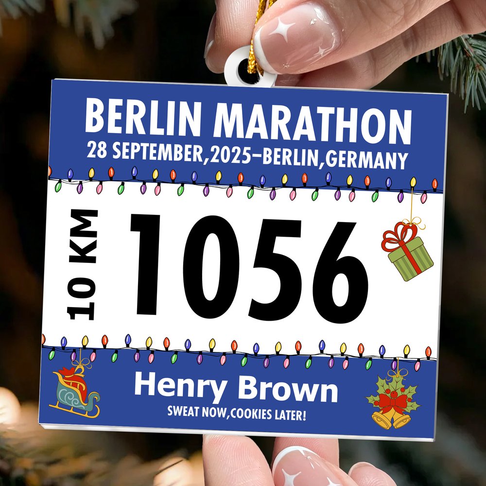 Este adorno presenta un dorsal de carrera con elementos navideños como luces, regalos y trineos. Puedes elegir entre 13 colores de fondo, personalizar tus propios eslóganes e introducir información sobre la carrera como el nombre, la distancia y el número de dorsal, convirtiendo el adorno en un recuerdo único que combina los logros de la carrera con la alegría navideña.
