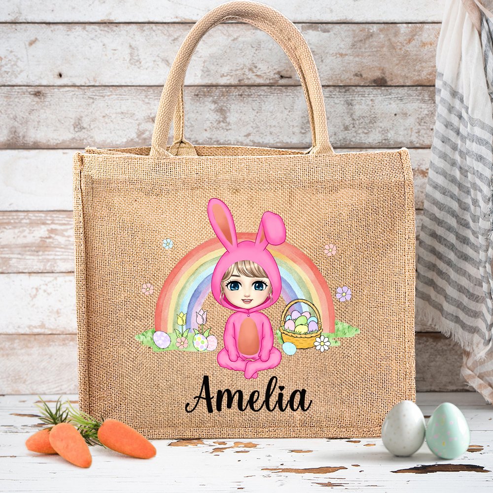 Nuestros bolsos tote combinan elementos de conejitos con dibujos de personajes de dibujos animados en colores brillantes y estampados vivos. El uso de elementos del arco iris hace que toda la bolsa sea colorida y llena de primavera. También puede personalizar el nombre del niño en la bolsa para hacerla más específica.