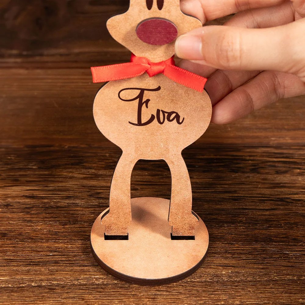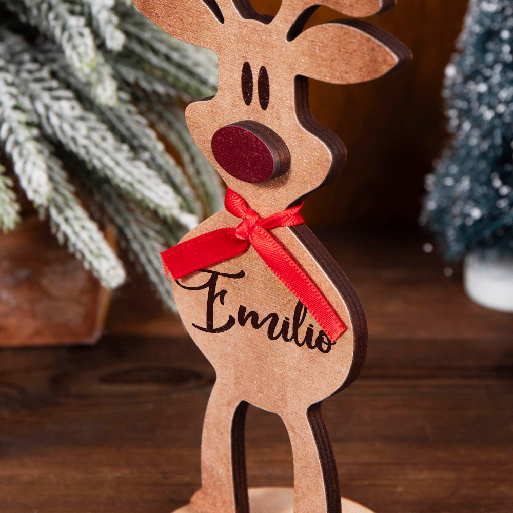 El adorno presenta un adorable y encantador diseño de reno que aporta un toque caprichoso a tu decoración navideña. Su aspecto rústico, con una simpática nariz roja y un lazo festivo, lo convierte en una pieza destacada en cualquier hogar durante la temporada navideña. También se puede personalizar con nombres, lo que lo convierte en un recuerdo significativo que celebra a tus seres queridos.