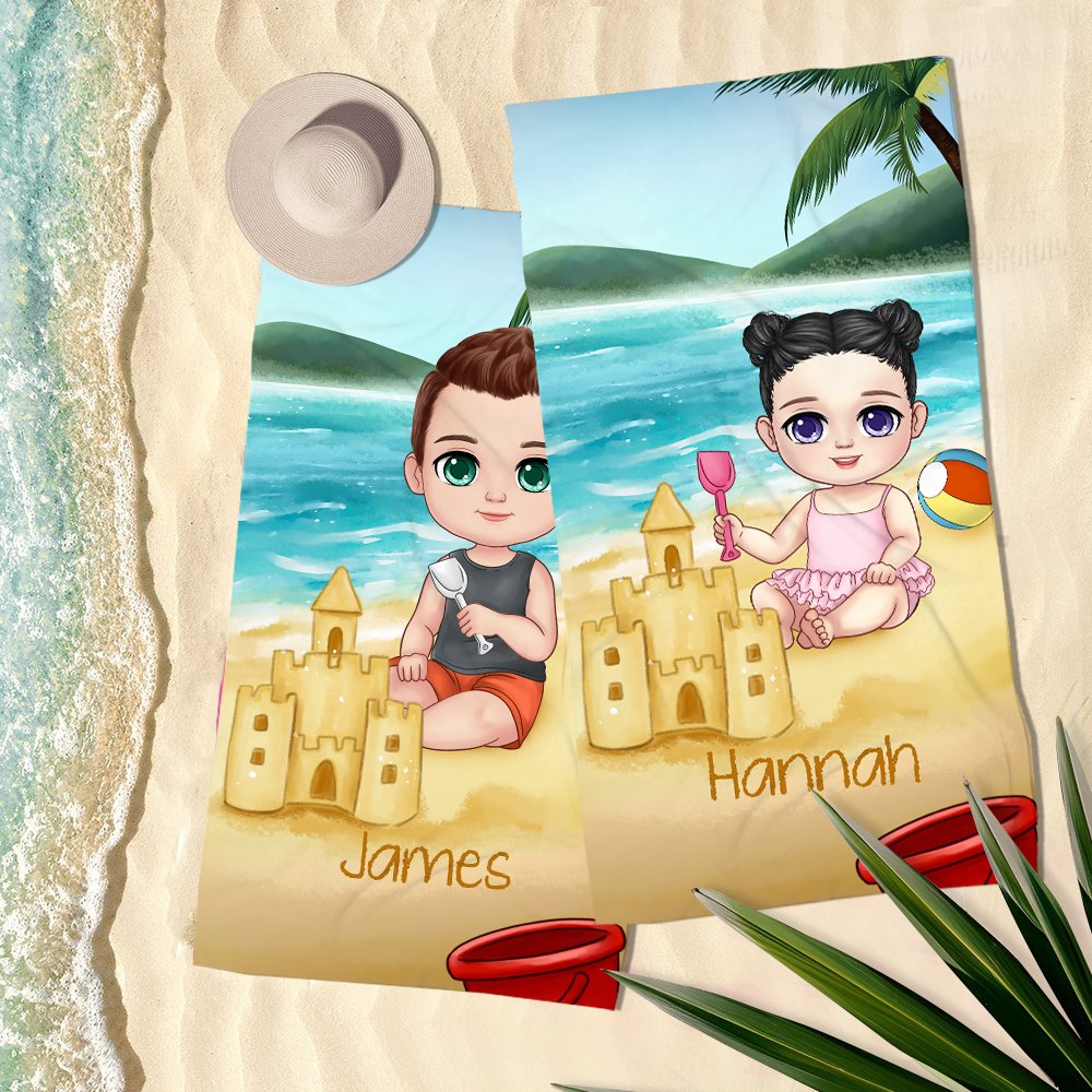 Esta toalla de playa presenta un encantador tema de niños construyendo castillos de arena junto al mar, capturando la esencia del verano y la diversión infantil. Puedes personalizarla con adorables dibujos animados de bebés o niños, así como con el nombre de tu hijo, para que cada toalla sea única y realce la alegría de jugar en la playa.
