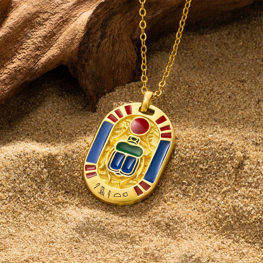 El escarabajo es un poderoso símbolo de la antigua cultura egipcia, que representa la protección y el renacimiento. Llevar este collar no sólo realza tu estilo, sino que también te conecta significativamente con la historia y el simbolismo. Grábalo con un nombre o una palabra significativa, convirtiéndolo en una pieza de joyería única que refleja tu historia personal y tu herencia.