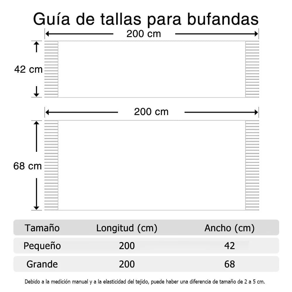 1. Debido a las diferentes partidas de producción, el borde de la bufanda de tamaño pequeño puede variar; por favor, consulta el producto real. 2. Debido a la medición manual y a la elasticidad del tejido, puede haber una diferencia de 2 a 5 cm en las dimensiones. 3. Si aparece un ligero apelmazamiento, trátalo suavemente con un peine profesional para lana o una rasuradora para pelusa.