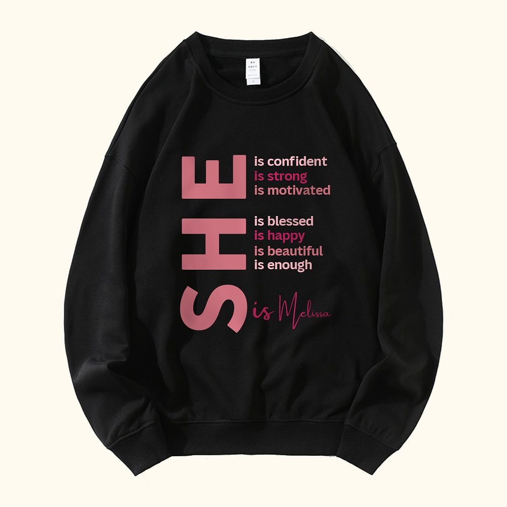 Esta prenda transmite un mensaje inspirador: "Ella es segura de sí misma/fuerte/positiva/bendita/feliz/hermosa/suficiente", blasonado en la prenda con texto positivo. Puedes personalizarla con un nombre para que esta prenda sea realmente única. Sus colores vibrantes y su mensaje edificante son un recordatorio diario de la belleza de la fortaleza, la resistencia y el autocuidado.