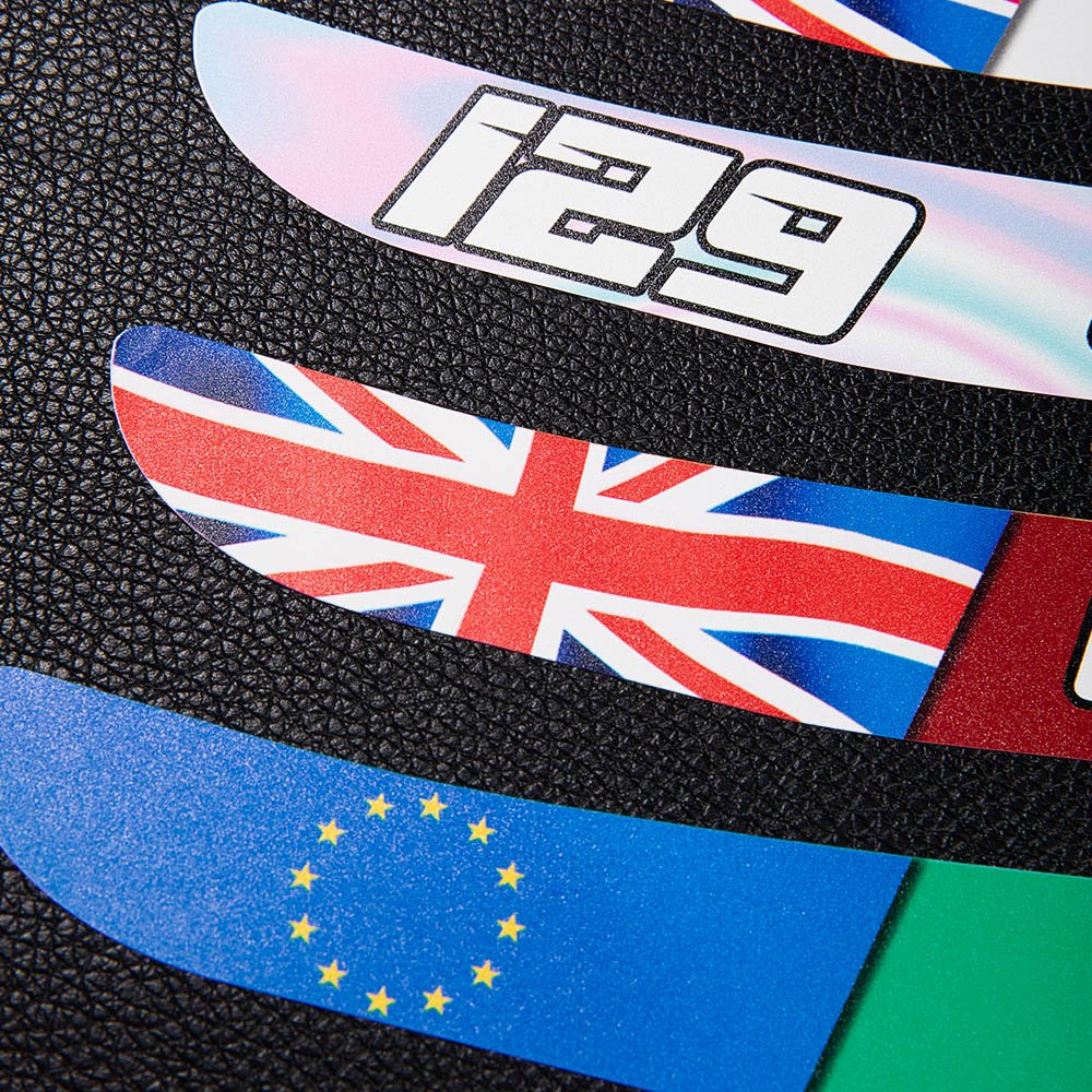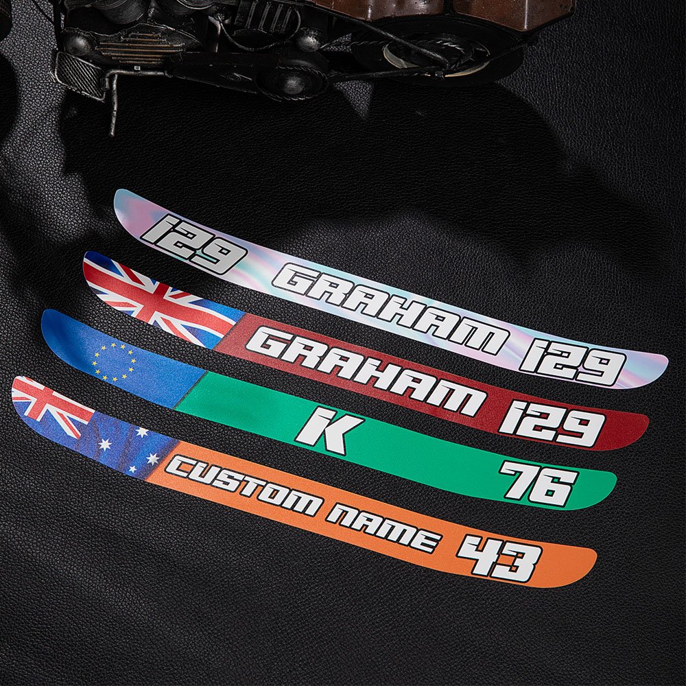 Adhesivos personalizados para colocar en cascos de moto con banderas de países, nombres de personas y números en colores vivos y destacados para resaltar la afición a las carreras de motos.