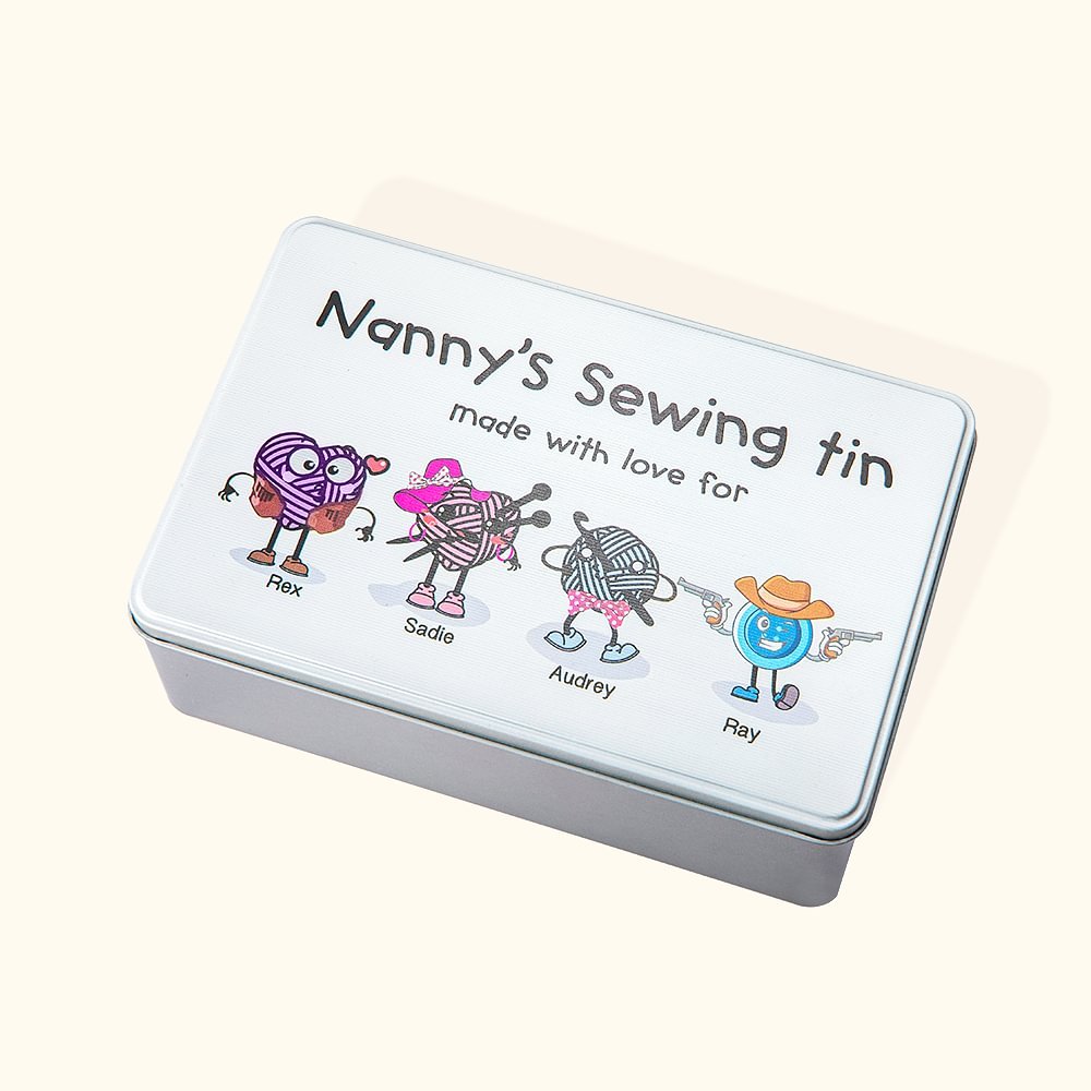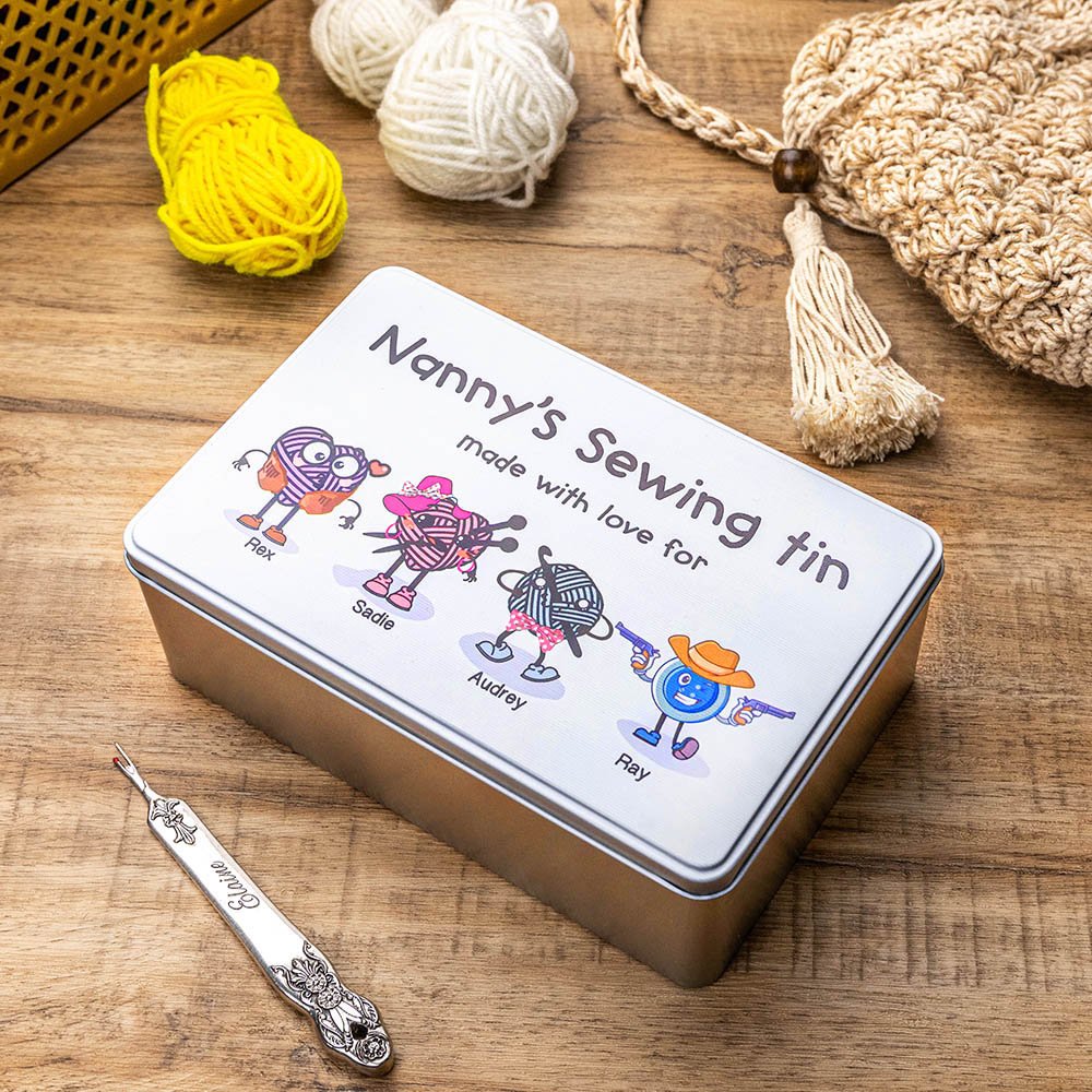 Lata personalizada para guardar el kit de costura con un personaje de dibujos animados de costura