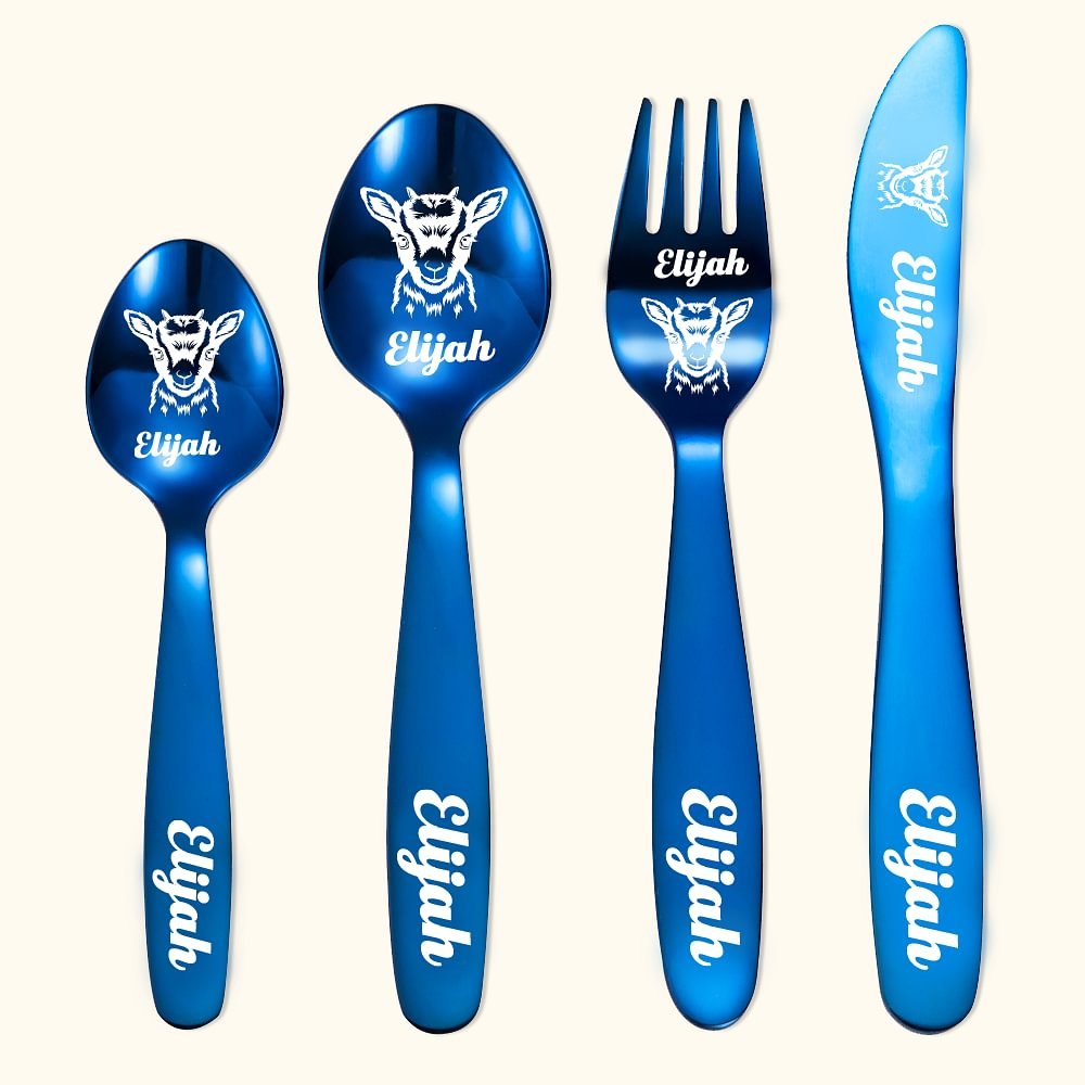La vajilla se puede personalizar con cualquier nombre o palabra con un límite de 10 caracteres. Además, también puede elegir su patrón favorito de ovejas y el color de los cubiertos.