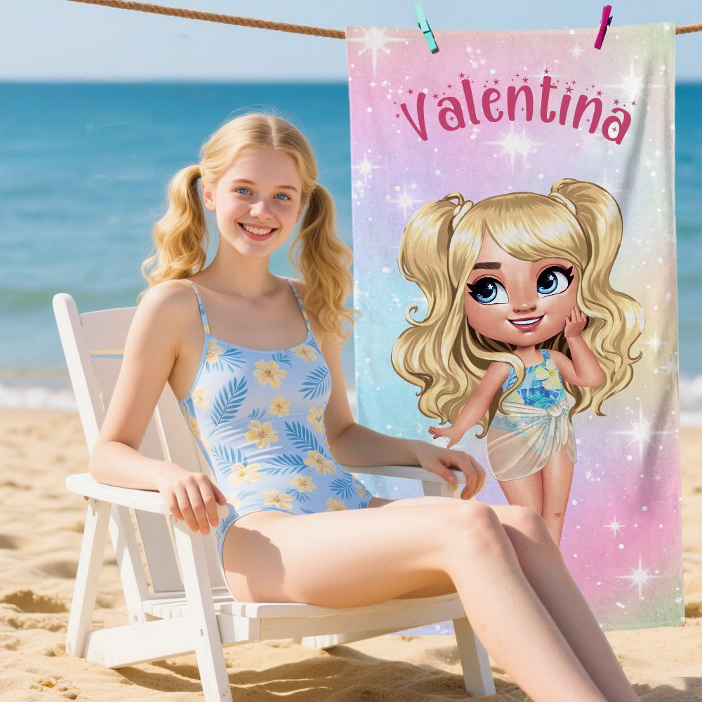 Esta toalla de playa tiene como fondo una estrella brillante en degradado, que puede personalizarse con la imagen de una chica guapa y elegante, creando un efecto visual lleno de vitalidad juvenil. También puedes personalizar tu nombre para que cada toalla se convierta en tu artículo exclusivo.