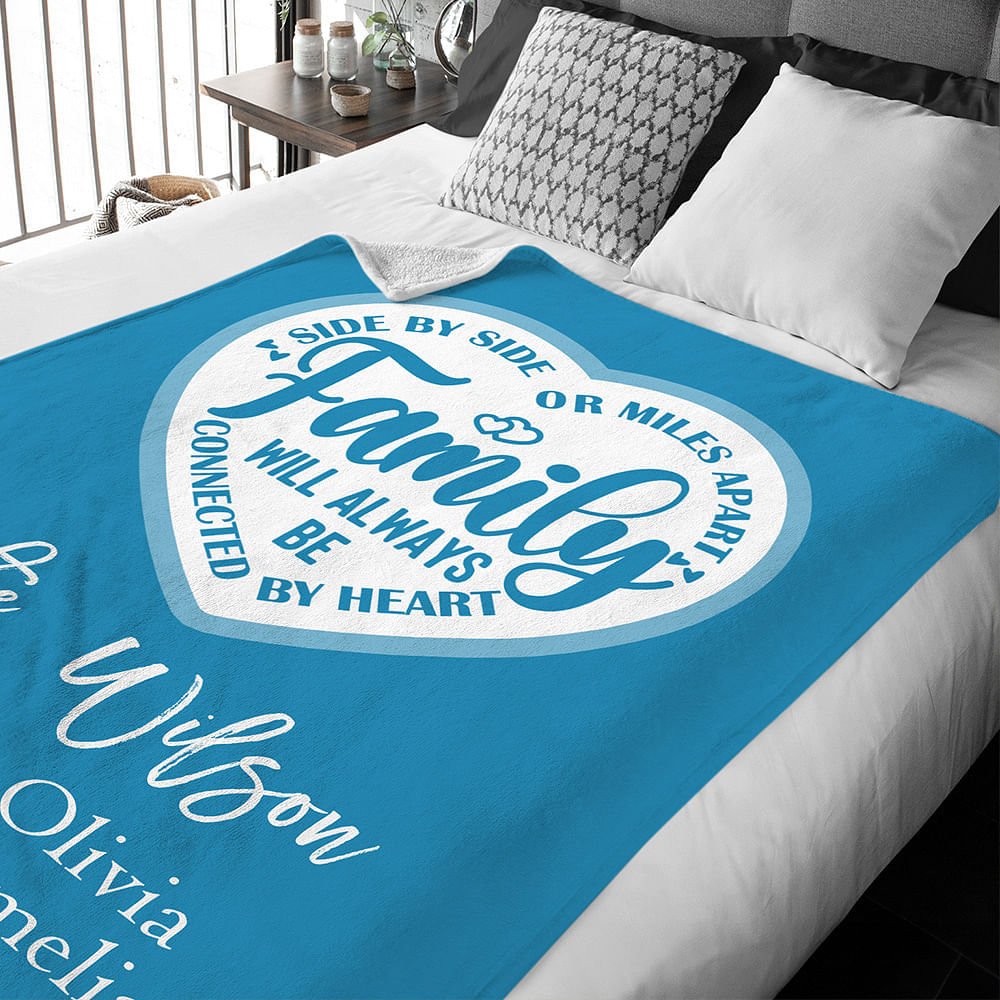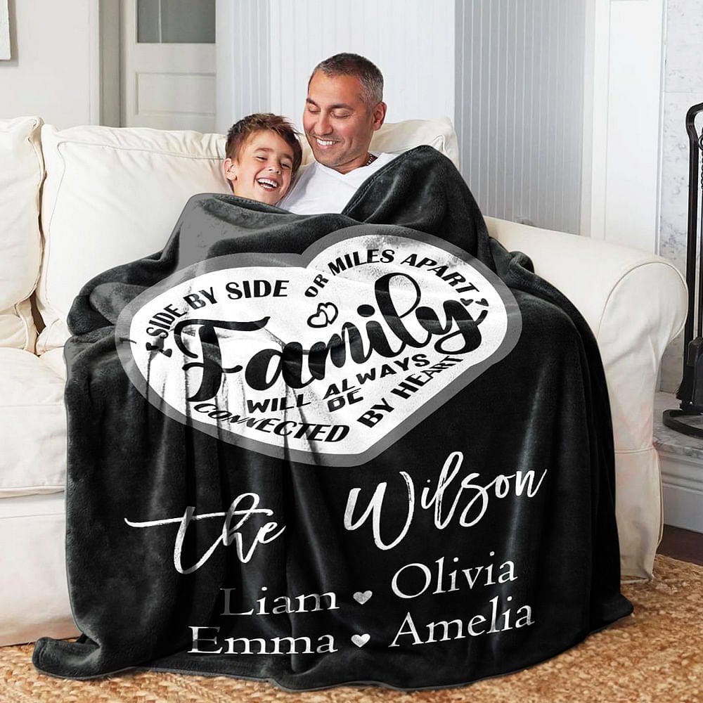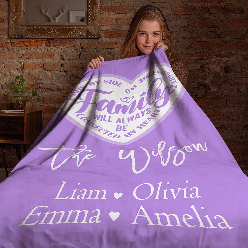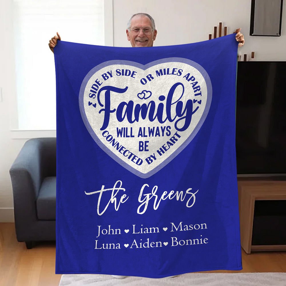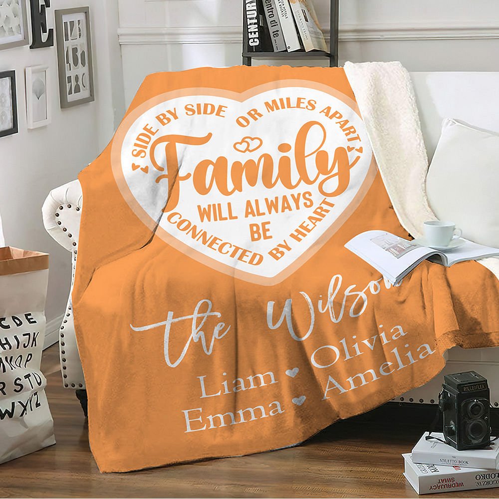 Nuestra manta está diseñada con un dibujo de corazón en el centro. Las palabras "La familia siempre estará conectada por el corazón" rodean el corazón, mostrando la profunda conexión y el amor entre cada miembro de la familia. Para crear una manta familiar única y significativa, puede personalizar los nombres de 1 a 24 miembros de la familia a continuación.