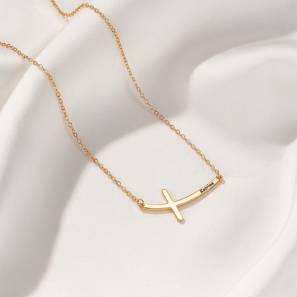 Este collar presenta un diseño de cruz curvada. Puedes grabar tu nombre, la fecha del bautizo o cualquier otro texto que desees personalizar. Esto hace que el collar sea algo más que un accesorio.