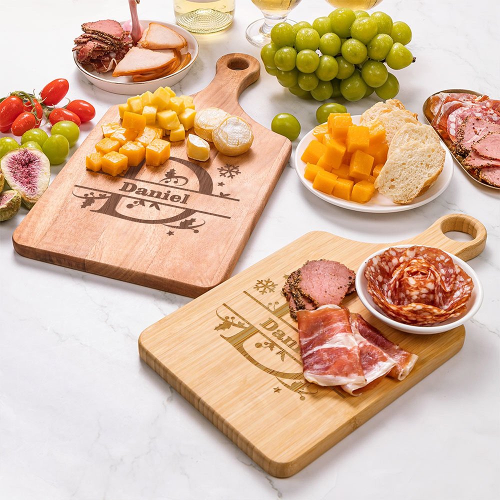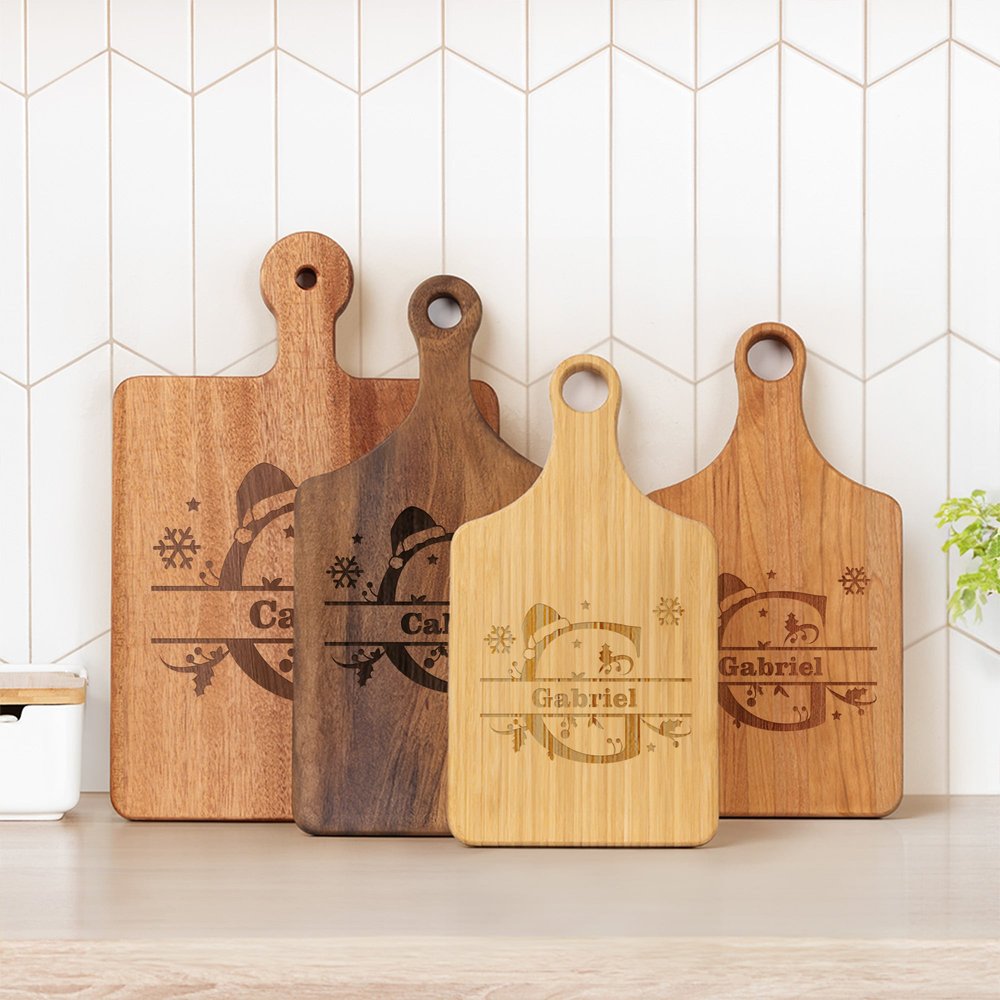 Esta tabla de cortar presenta un diseño grabado a medida: su nombre, inicial y motivos festivos, como gorros de Navidad, copos de nieve y acebo, grabados en madera natural. El mango ergonómico añade funcionalidad, mientras que el veteado único de la madera, que incluye nudos naturales, hace que cada tabla sea única, combinando el encanto personalizado con el uso práctico en la cocina.