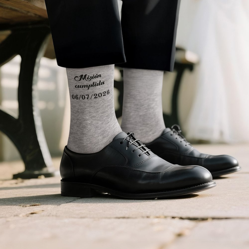 Puedes elegir tu apodo entre cuatro opciones, incluyendo "Father of the Bride" y "Father of the Groom", y también puedes seleccionar "Special Socks for a Special Walk" o "Of all Our Walks this One is My Favorite", así como otras cuatro frases especiales. Los apodos y textos se pueden personalizar, y se pueden agregar fechas de boda para crear unos calcetines únicos y exclusivos, añadiendo un toque especial y ceremonial al día de la boda.