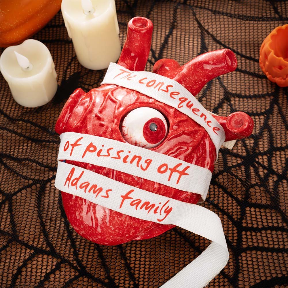 Esta decoración adopta la forma de un corazón con un globo ocular incrustado y una venda enrollada alrededor del corazón, creando un adorno terrorífico y creativo. El texto "Las consecuencias de cabrearse" también está impreso en la venda, creando una atmósfera misteriosa e inquietante. También puedes personalizar tú mismo el texto para hacerlo más personal.