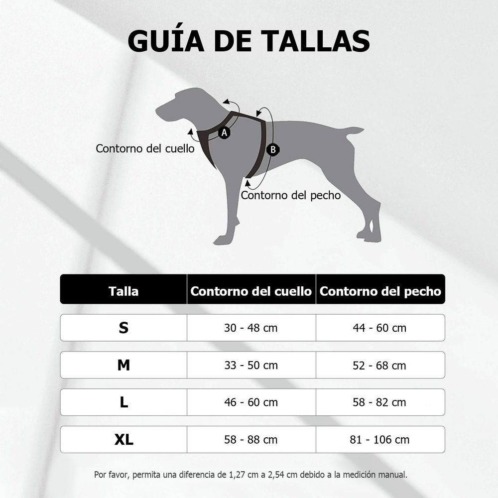 | Medidas: | S - Contorno del cuello - 30-48 cm, Contorno del pecho - 44-60 cm M - Contorno del cuello - 33-50 cm, Contorno del pecho - 52-68 cm L - Contorno del cuello - 46-60 cm, Contorno del pecho - 58-82 cm XL - Contorno del cuello - 58-88 cm, Contorno del pecho - 81-106 cm |