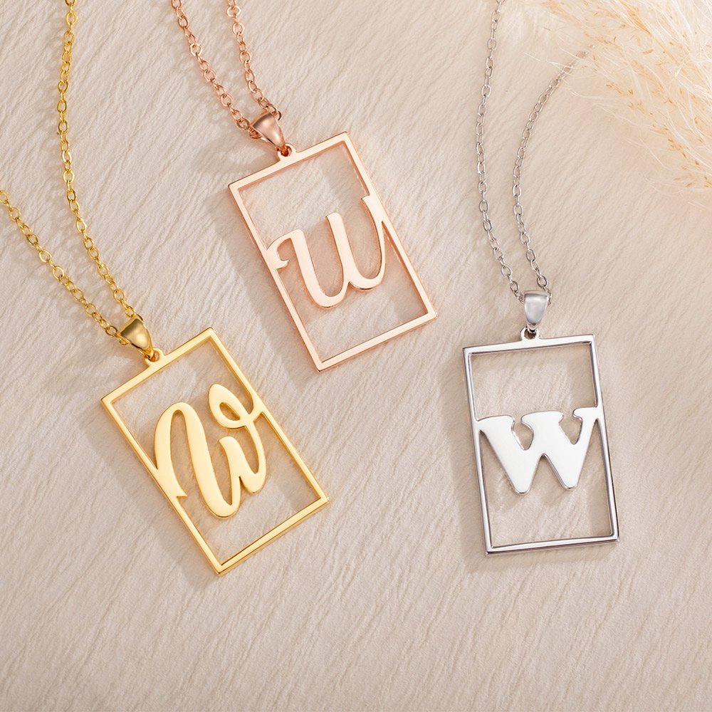| Característica: | Duradero, brillo lustroso, hipoalergénico, minimalista, diseño cuadrado hueco, colgante con inicial |