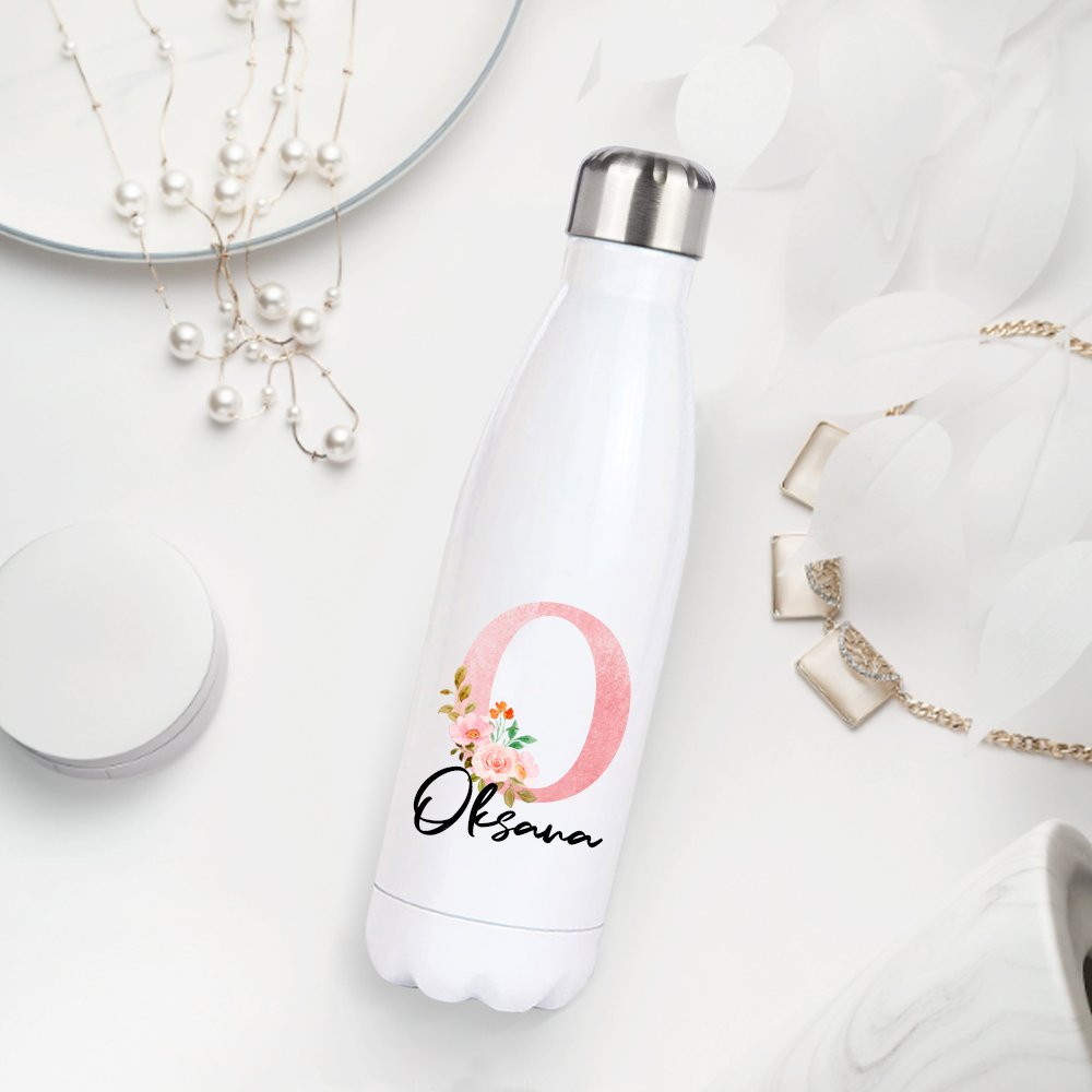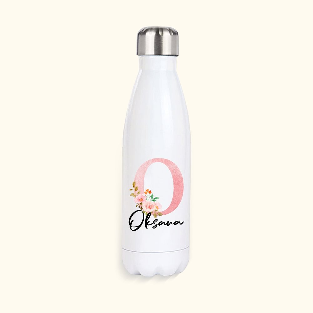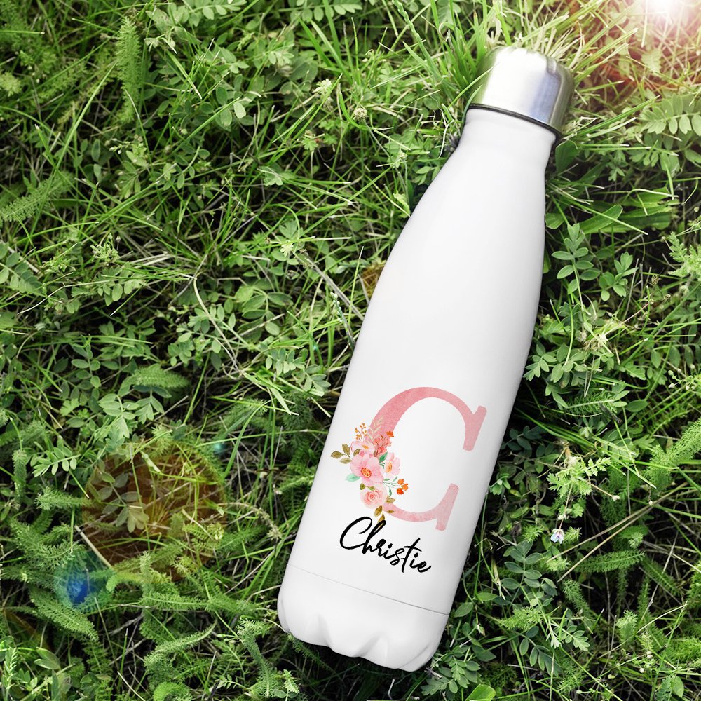 Esta botella de agua de moda cuenta con 3 estilos de letra mayúscula con decorado con un zarcillo de flores. El nombre que desee se imprimirá en negro debajo.