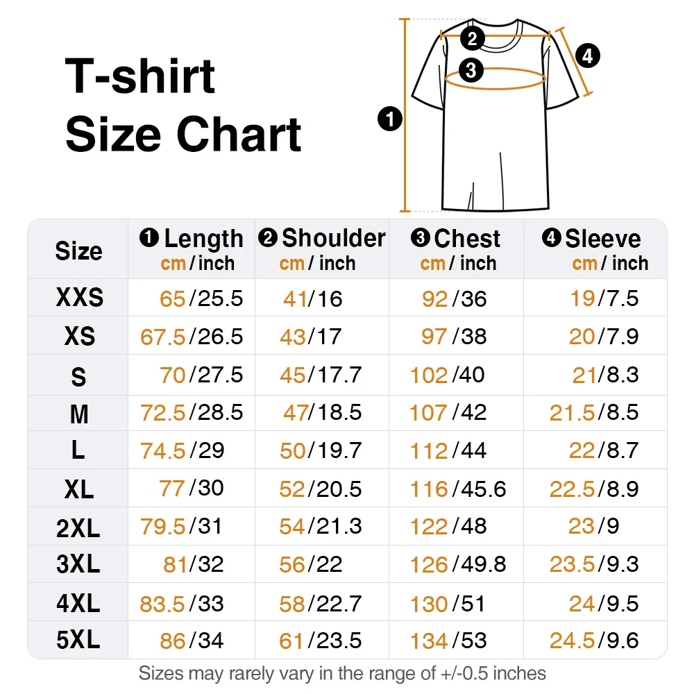 | Medidas: | Camiseta adulto - XXS, XS, S, M, L, XL, 2XL, 3XL, 4XL, 5XL Camiseta para niños - 3-4Y, 5-6Y, 7-8Y, 9-10Y, 11-12Y, 13Y |