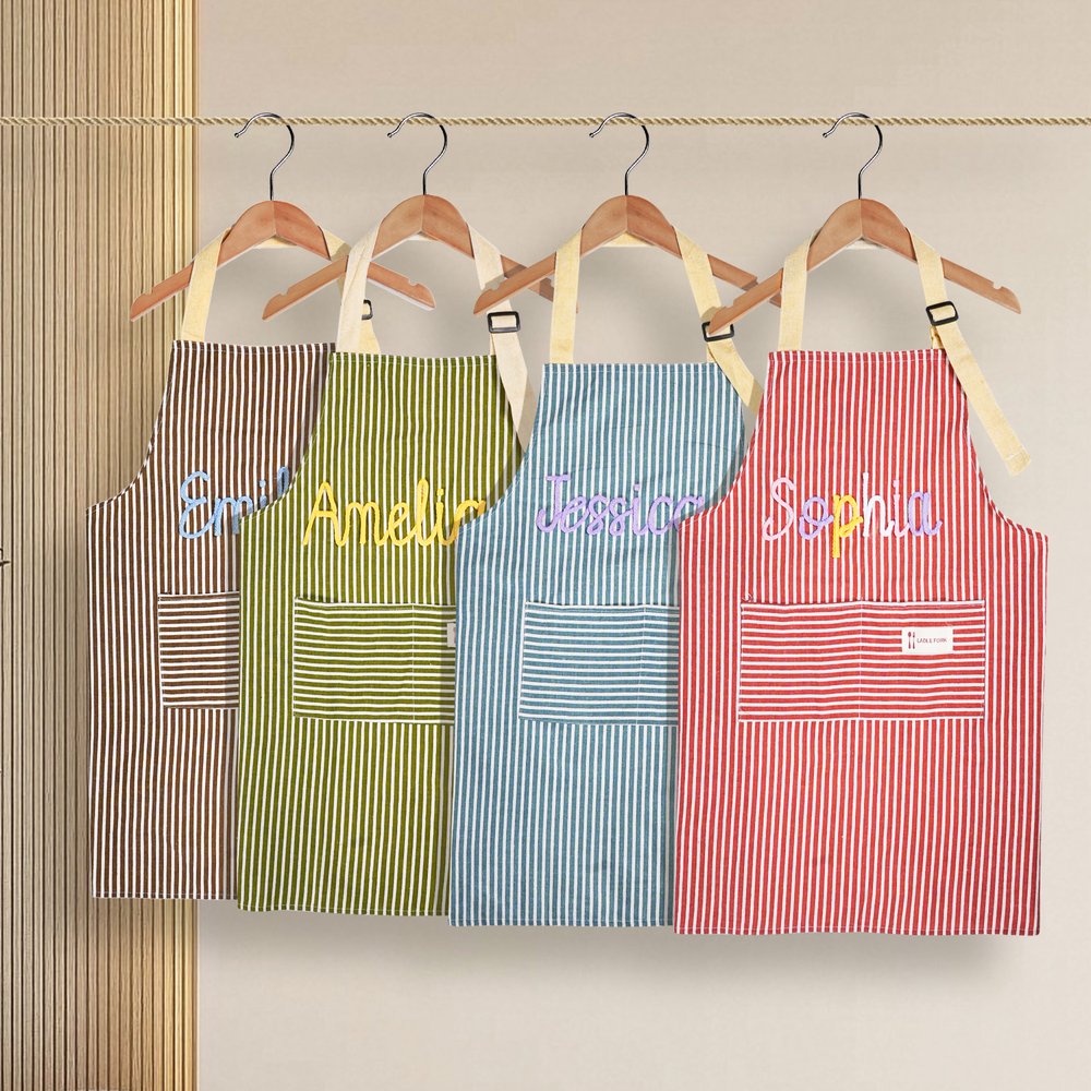 Este delantal tiene un diseño encantador con vibrantes dibujos a rayas para añadir estilo a las tareas diarias. Su característica más destacada es el nombre personalizado tejido a mano, que te permite personalizarlo con tus colores de hilo favoritos para darle un aspecto único e individual. También tiene un práctico bolsillo delantero para acceder fácilmente a pequeños objetos, combinando a la perfección moda y funcionalidad.