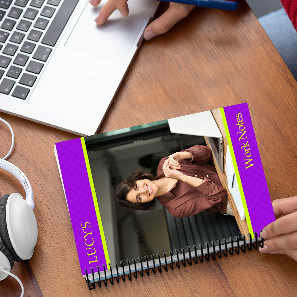La cubierta de este cuaderno se puede personalizar con fotos personales, como fotos de viajes, familiares o eventos especiales, lo que hace que cada cuaderno sea único. La cubierta del cuaderno también está impresa con texto personalizado y motivos geométricos, lo que añade un toque vivo y moderno al cuaderno.