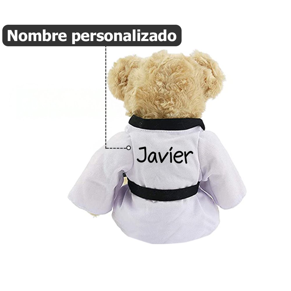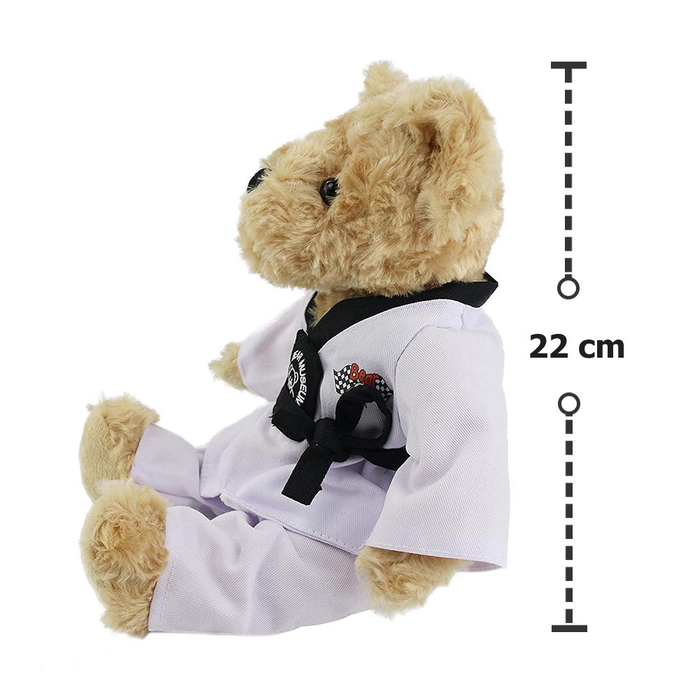 Este es un oso de peluche personalizado de 25 cm. El uniforme de taekwondo está confeccionado a mano en 100 % poliéster, similar al real. La ropa es removible y puede ponerse y quitarse fácilmente.