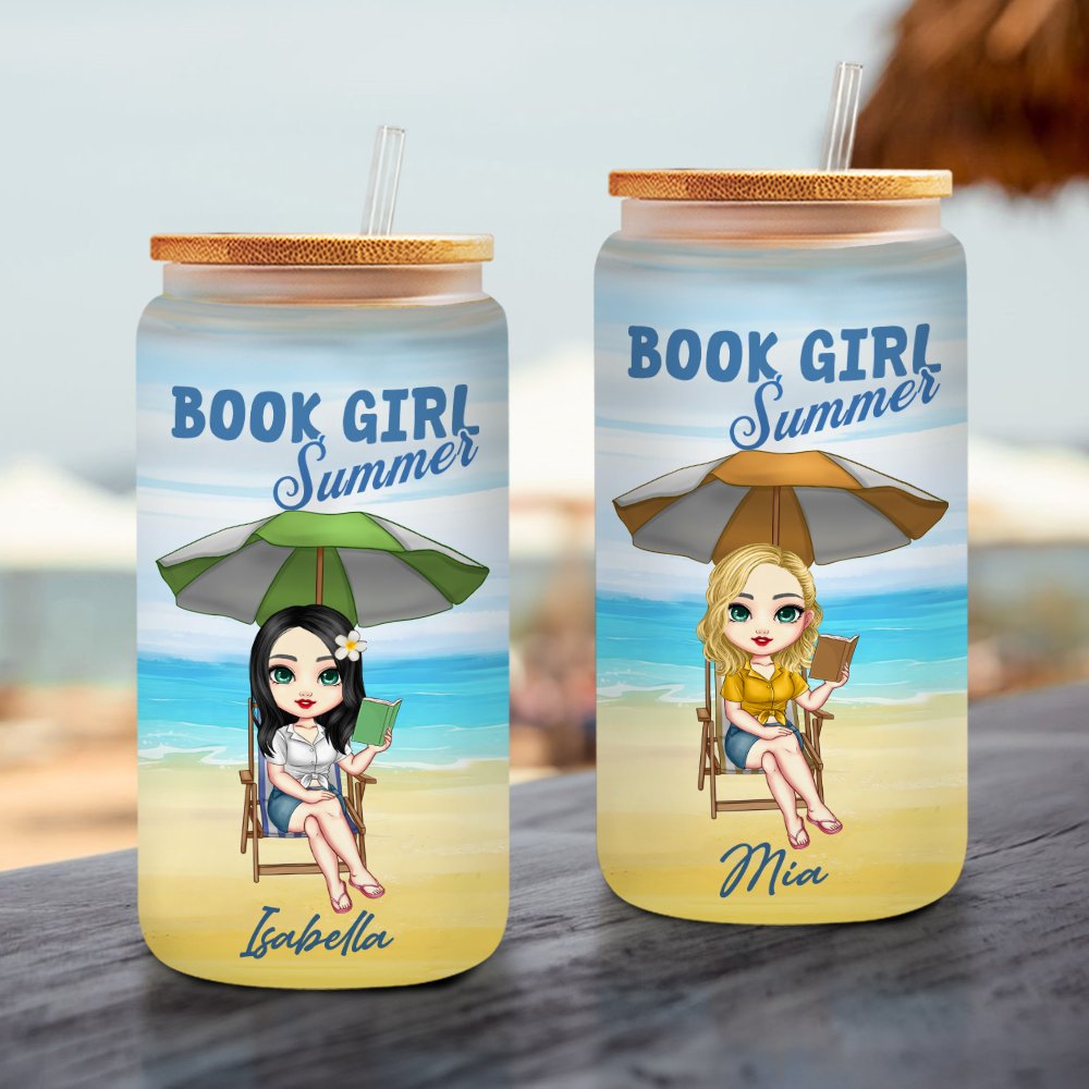 Esta taza esmerilada presenta a una niña de dibujos animados leyendo un libro a la orilla del mar, y puedes personalizar este personaje para que se parezca a tu imagen. Con un telón de fondo de playas de arena, el océano y un cielo azul, desprende un fuerte ambiente vacacional. También puedes personalizarlo con tu nombre para crear un vaso único.