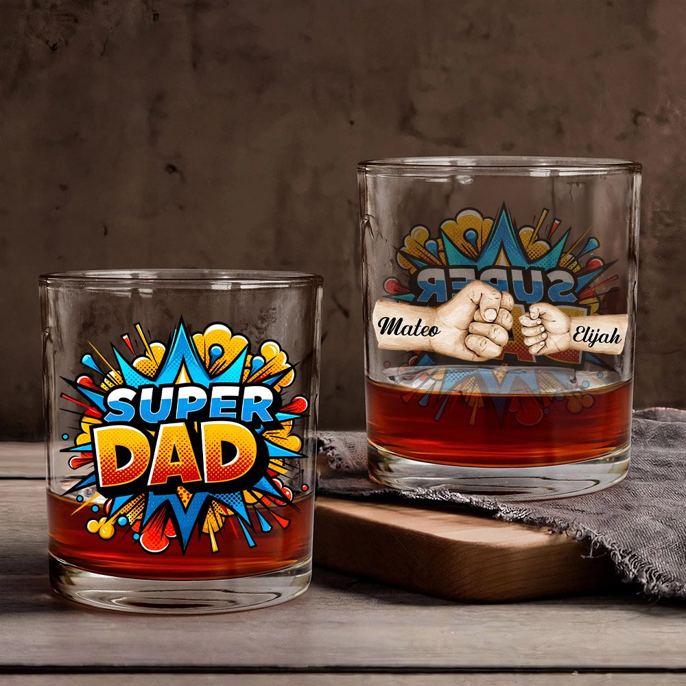 Este vaso de whisky lleva impresas las palabras "SUPER DAD" en una cara, rodeadas de coloridos motivos de explosión, que muestran vitalidad y dinamismo. La otra cara está centrada en el motivo del puñetazo y puede personalizarse con las manos de 1 a 6 niños, que simbolizan la estrecha relación entre padre e hijo. Los nombres del padre y del hijo están impresos debajo, lo que añade exclusividad.