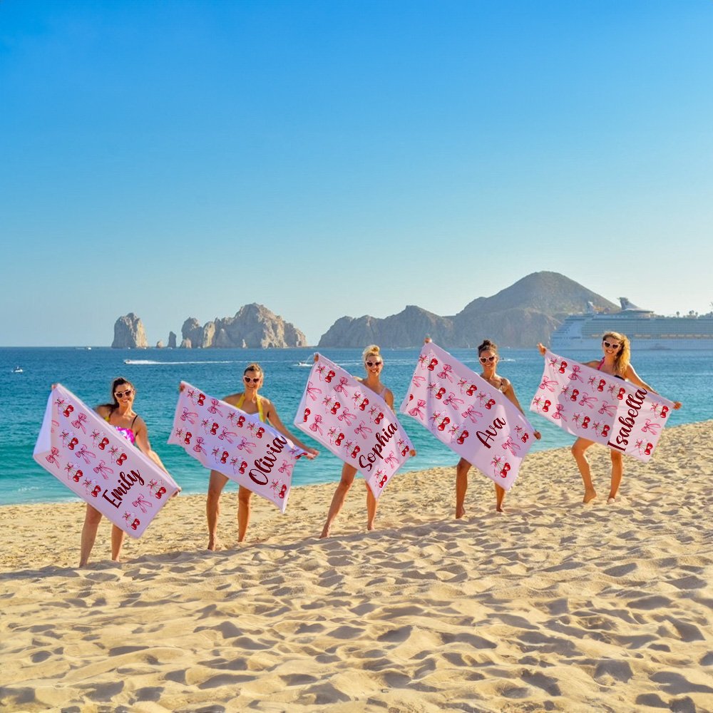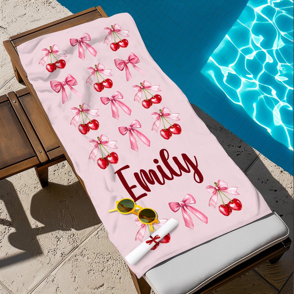 Inspirada en el corazón de niña y el estilo retro dulce, esta toalla de playa está decorada con elementos de cereza rosa y lazos Coquette y se combina con un nombre exclusivo personalizable, lo que hace que cada toalla sea única. El color general es fresco y suave, dulce pero no graso, exudando una atmósfera romántica y juguetona, convirtiéndose fácilmente en la presencia más llamativa de la playa.