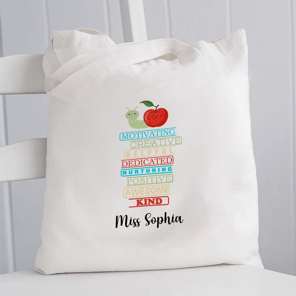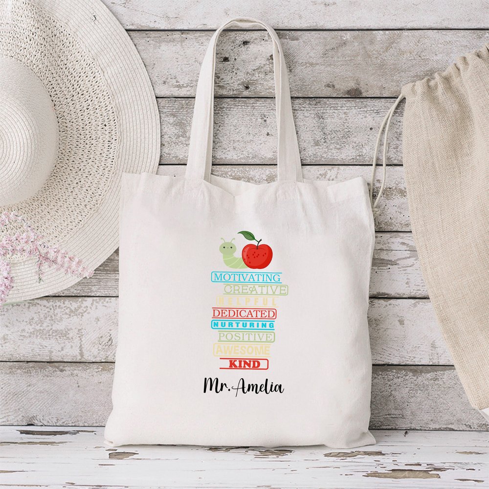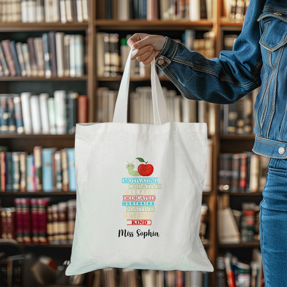 Esta bolsa de lona de temática docente presenta un encantador diseño en forma de libro, complementado con un cálido texto y divertidas ilustraciones de una oruga y una manzana. Especialmente diseñada para educadores, expresa respeto y admiración por la profesión docente. Puede personalizar la bolsa con el nombre del profesor, convirtiéndola en un accesorio personal que lleva un toque único.