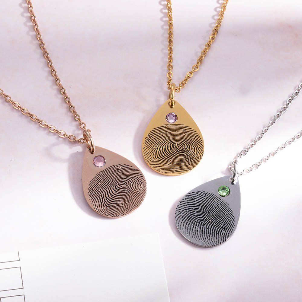 Este collar es un regalo precioso y lleno de significado. El colgante tiene forma de lágrima, con un diseño exclusivo de huella dactilar y piedra de nacimiento, único y elegante. La huella dactilar de cada persona es única y tiene un significado especial. La huella dactilar real de la persona cercana se convierte en un collar, que puede conservarse durante mucho tiempo. El reverso también se puede personalizar con lo que se quiera decir a la otra persona, lo que puede representar la añoranza por el ser querido y también tiene un gran significado conmemorativo.