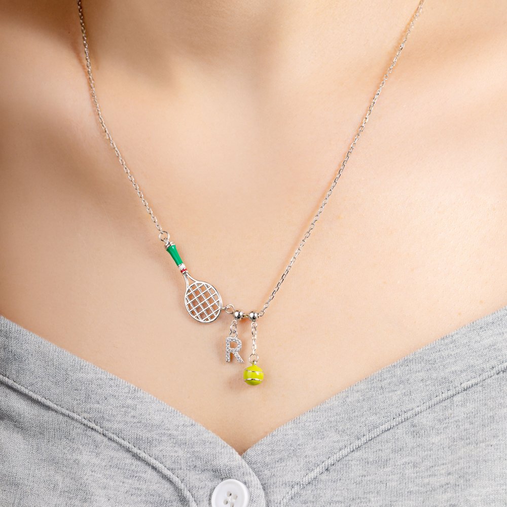 Elaborado con meticuloso detalle, el colgante presenta una delicada réplica de una raqueta de tenis, con sus cuerdas grabadas con precisión, combinada con una pelota de tenis microtexturada que imita la icónica superficie de fieltro de este deporte. La letra personalizada lo convierte en un elegante accesorio para demostrar el amor por el tenis.