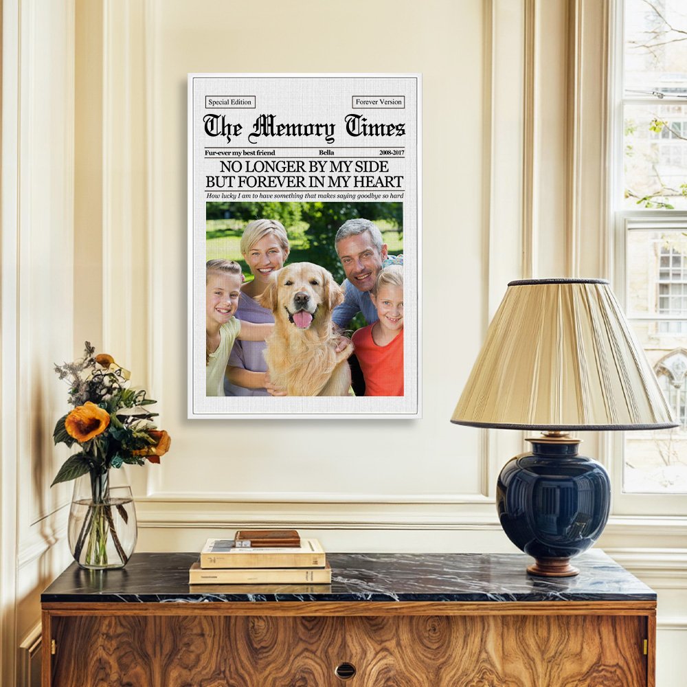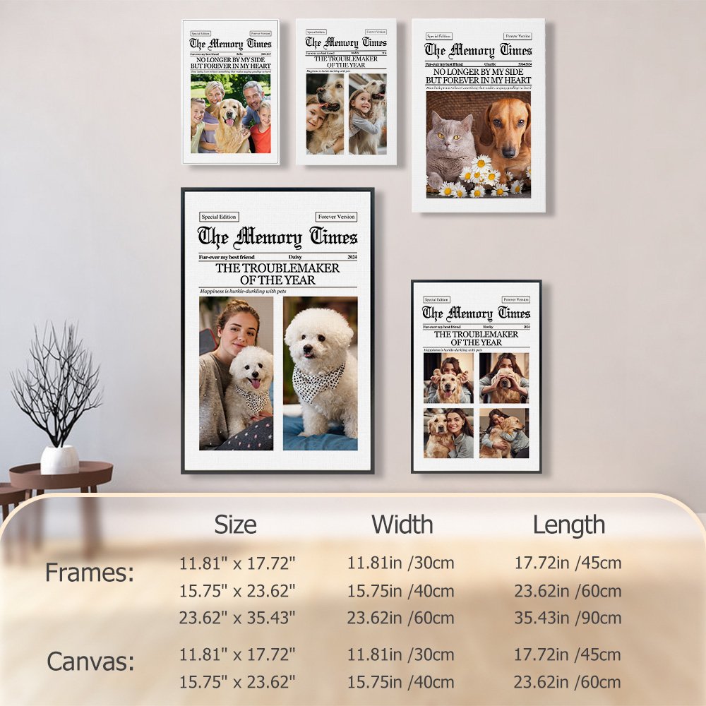 Este cuadro combina hábilmente el diseño de un periódico con elementos individuales. Su inspiración única en el diseño de periódicos añade un encanto clásico y moderno a los preciados recuerdos. Puede personalizar a su gusto las fotos conmemorativas, los textos y los nombres de sus mascotas, haciendo que cada pieza sea única y personal.