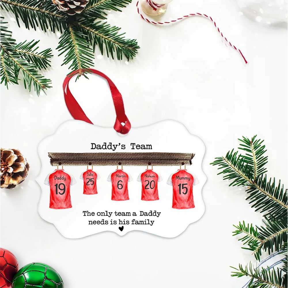 Nuestro adorno navideño de camiseta familiar de fútbol te permite personalizar los nombres, y números de los miembros de tu familia, creando un equipo de fútbol familiar único que representa el amor de tu familia por el fútbol. El diseño personalizable lo convierte en un regalo perfecto para padres, abuelos o maridos apasionados por el fútbol.
