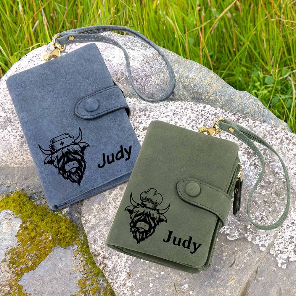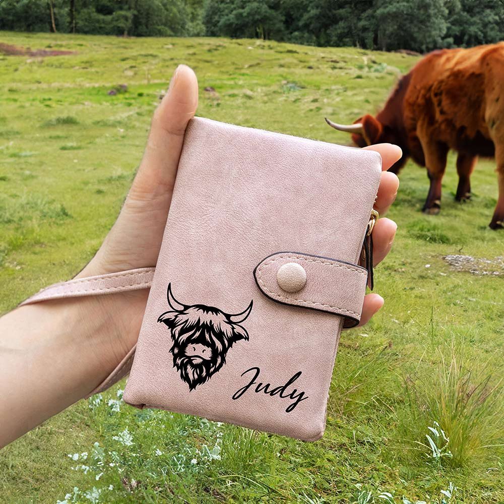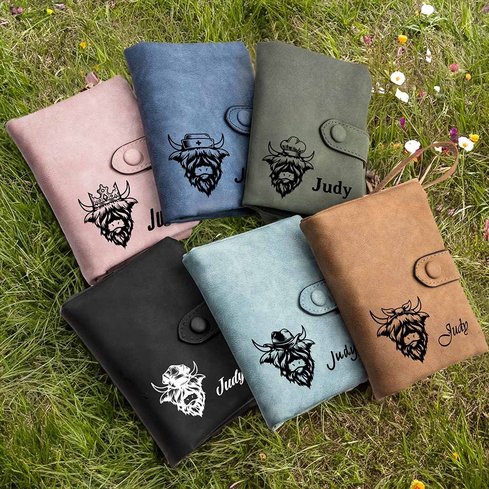 Se trata de una bonita y exclusiva cartera que se puede personalizar con tu diseño favorito de vaca de las tierras altas y el nombre del destinatario, lo que le añade un toque distintivo y personalizado, convirtiéndola en un regalo significativo y apreciado.