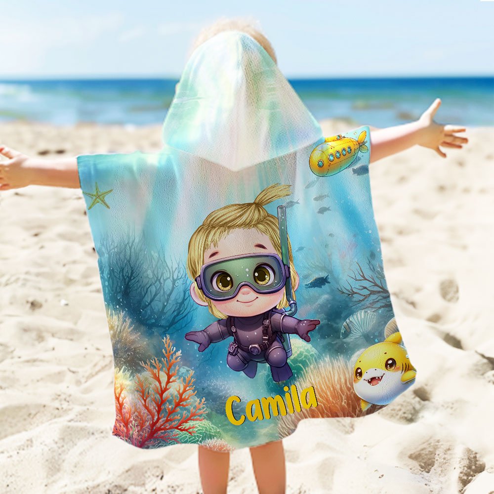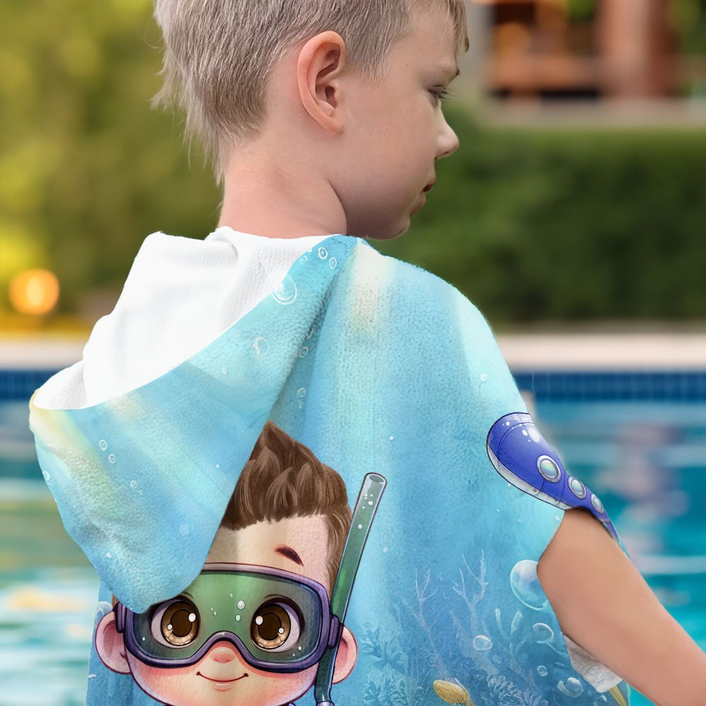 Esta toalla de playa con capucha y capa presenta una temática del mundo submarino, adornada con entrañables personajes de dibujos animados y adorables dibujos de animales oceánicos, que crean una escena submarina vibrante y de ensueño. Cada toalla se puede personalizar con el nombre y el personaje de tu hijo, para que cada baño o experiencia de viaje sea muy especial y muestre su personalidad única.