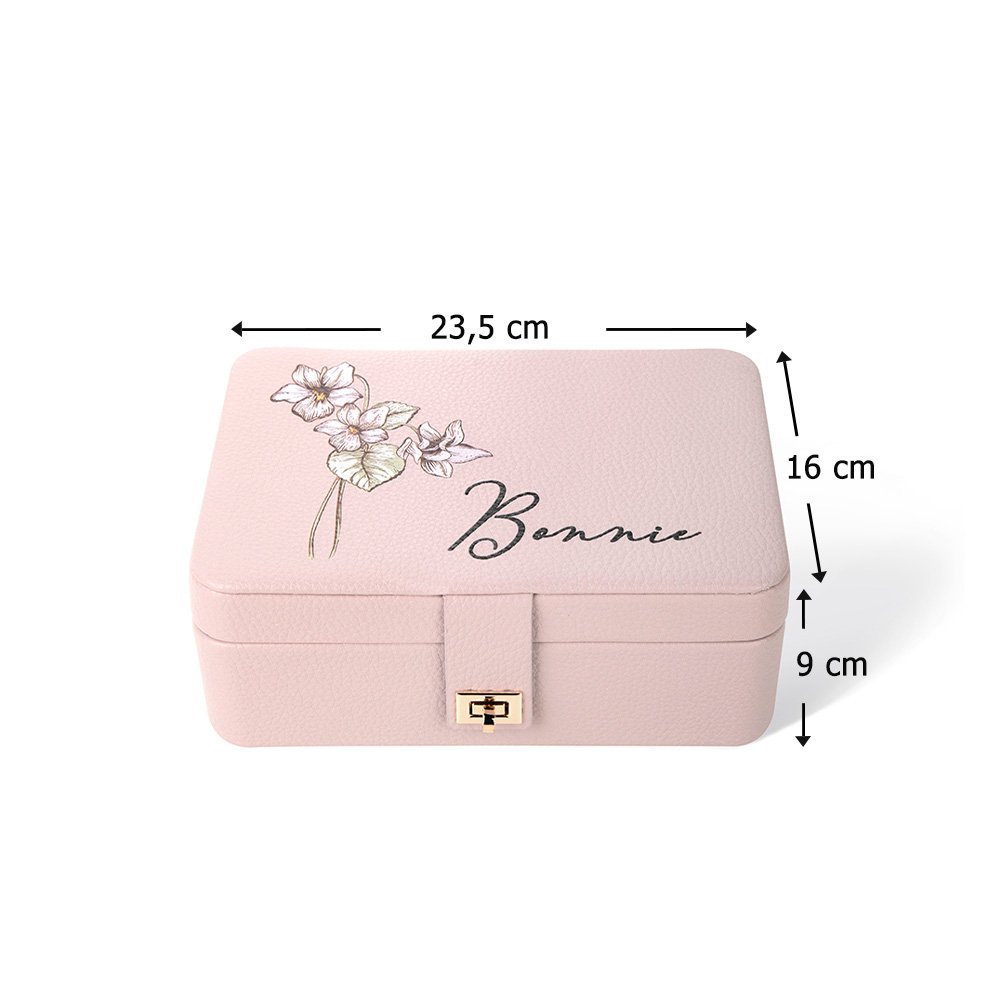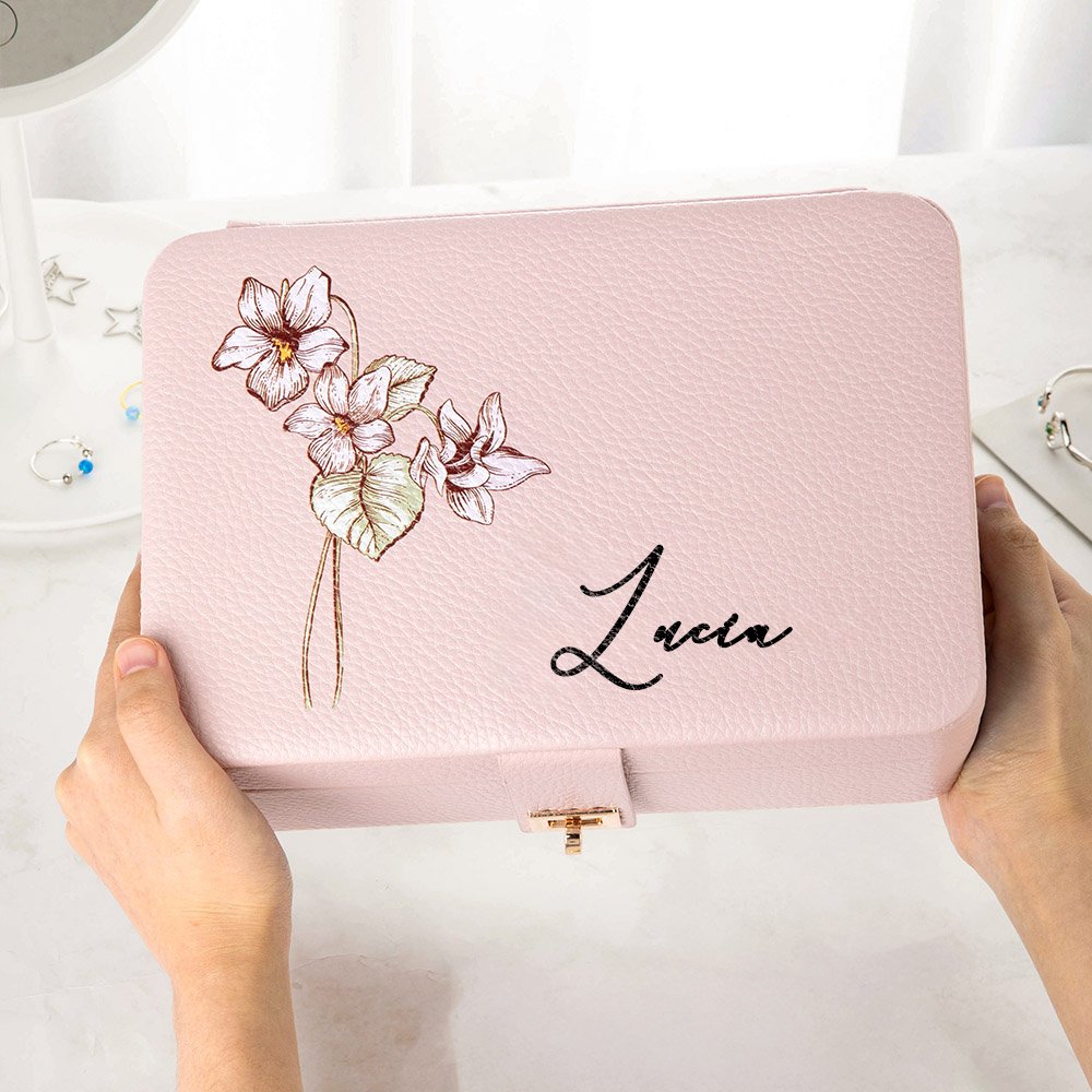 Este joyero está impreso con una flor de nacimiento, creando un ambiente romántico y elegante. El nombre se puede personalizar, lo que lo convierte no solo en un práctico utensilio de almacenamiento, sino también en una obra de arte que realza la personalidad.